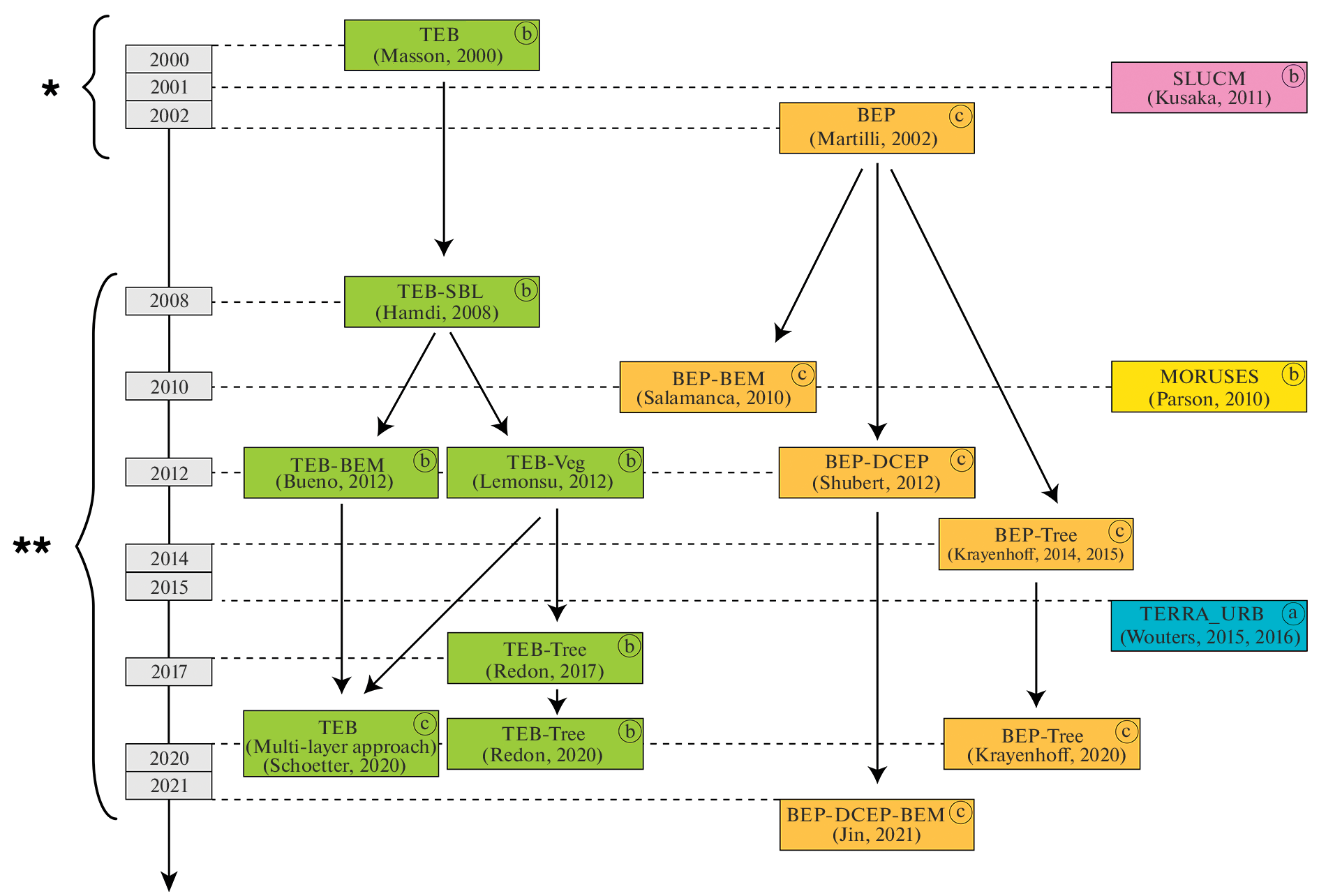 - Redon E., Lemonsu A., Masson V. An urban trees parameterization for modeling microclimatic variables and thermal comfort conditions at street level with the Town Energy Balance model (TEB–SURFEX v8.0) // Geosci. Model Dev. 2020. V. 13. P. 385–399.