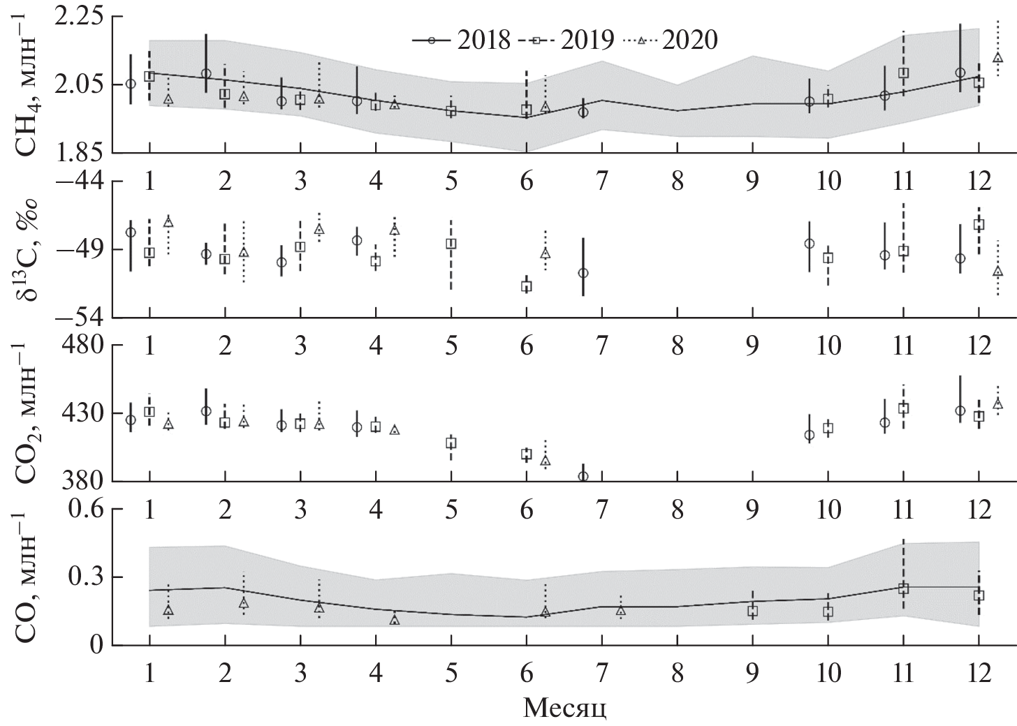 - Lopez M., Sherwood O.A., Dlugokencky E.J., Kessler R., Giroux L. et al. Isotopic signatures of anthropogenic CH4 sources in Alberta, Canada // Atmospheric Environment. 2017. V. 164. P. 280–288. ffhttps://doi.org/10.1016/j.atmosenv.2017.06.021