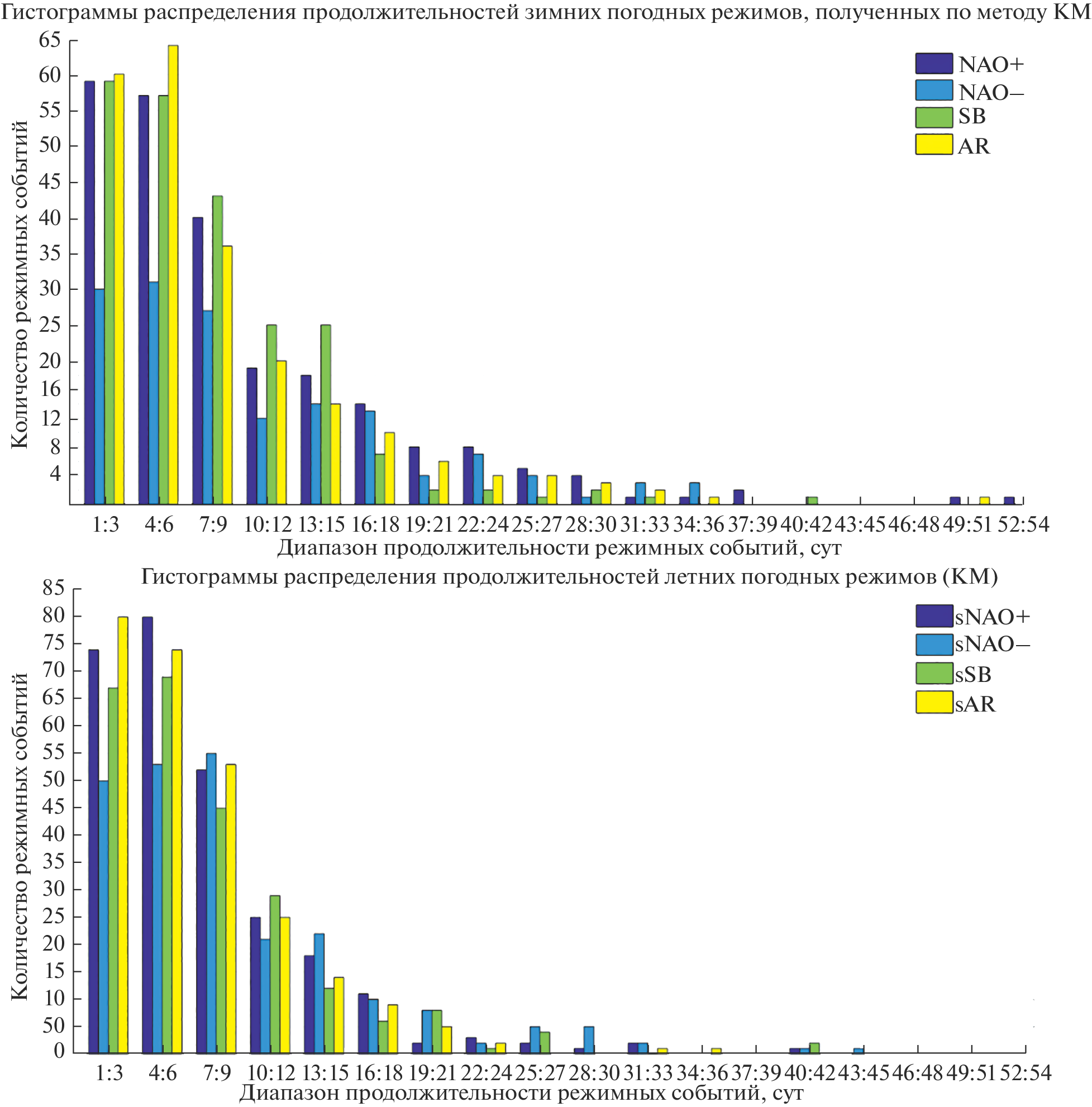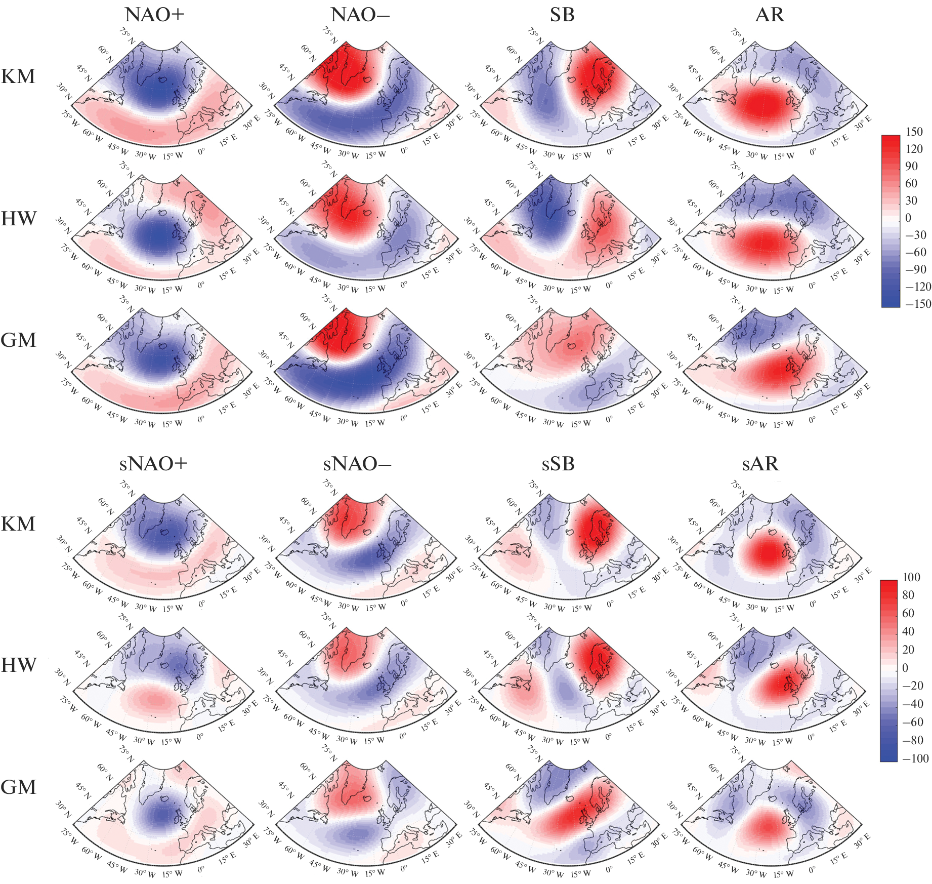 Для выделения режимов крупномасштабной атмосферной циркуляции (погодных режимов) используются различные методы кластерного анализа. В статье приведено сравнение четырех, наиболее часто используемых методов – k-means (KM), иерархической кластеризации Уорда (HW), модели Гауссовой смеси (GM) и самоорганизующихся карт Кохонена (SOM) на примере выделения погодных режимов в Евро-Атлантическом секторе. Использовались данные реанализа ERA5 для высоты геопотенциала на уровне 500 гПа (z500) для периода 1940–2022 гг. Для зимних месяцев методом KM выделялись четыре классических для Евро-Атлантики погодных режима – два режима, ассоциированные с положительной и отрицательной фазами Североатлантического колебания (NAO+ и NAO–), режим Скандинавского блокинга (SB) и режим, характеризующийся повышенным давлением над Северной Атлантикой. Для летних месяцев методом KM выделены режимы, похожие по пространственной структуре на зимние. Методом SOM выделяются режимы, практически неотличимые от режимов, полученных методом KM. В отличие от KM и SOM, методами HW и GM выделены режимы, характерная пространственная структура которых не полностью совпадает с четырьмя классическими зимними режимами в Евро-Атлантике и их летними аналогами. Режимами, полученными методами HW и GM, объясняется меньшая доля дисперсии z500, для них отличаются особенности переходов, относительные повторяемости и характерные продолжительности, а летние режимы меньше похожи на зимние по сравнению с режимами, полученными методом KM. Средние коэффициенты пространственной корреляции между характерными полями аналогичных режимов, детектированных методами KM и HW, составили 0.76 для зимы и 0.83 для лета, методами KM и GM – 0.70 для зимы и 0.72 для лета, методами HW GM – 0.41 и 0.44 соответственно. При использовании некоторых методов кластеризации выявлены статистически значимые тренды сезонной повторяемости режимов – положительный тренд “NAO+” и отрицательный тренд “NAO–”.