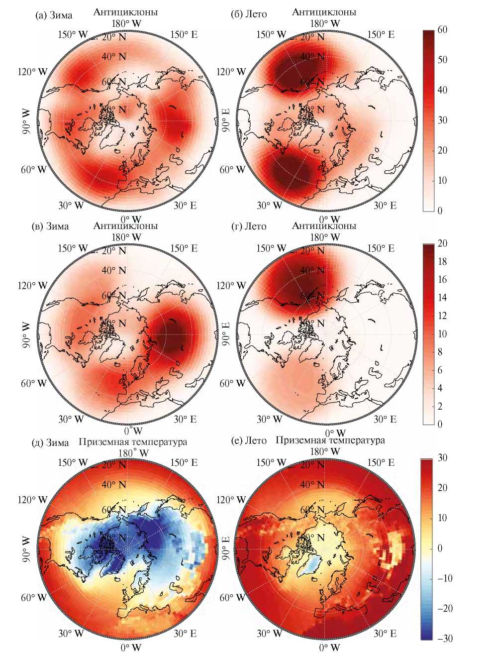 Рис. 1. Пространственные распределения средней повторяемости антициклонов [антициклоно-дни/сезон] (а, б), интенсивных антициклонов [антициклоно-дни/сезон] (в, г) и средней приповерхностной температуры [°C] (д, е) в Северном полушарии для зимнего (а, в) и летнего (б, г) сезонов по данным реанализа ERA5 для периода 1979–2021 гг.
