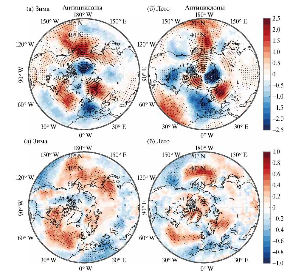 Области со статистически значимыми изменениями повторяемости антициклонов в последние десятилетия для летних (рис. 2б) и зимних (рис. 2а) сезонов существенно различаются. В частности, над Арктическим бассейном в западных широтах (в том числе над Гренландией) доминируют значимые положительные тренды повторяемости антициклонов, а в восточных – отрицательные. Область с наибольшими положительными значимыми трендами над Тихим океаном для летних сезонов смещается в средних широтах на запад по сравнению с зимними сезонами. При этом соответствующая область над Северной Атлантикой смещается на юг. В отличие от зимних сезонов, летом над значительной областью Северной Америки проявляется значительная область со статистически значимым отрицательным трендом повторяемости антициклонов. При этом над протяженными регионами Евразии, за исключением западноевропейских регионов, отмечен рост повторяемости антициклонов.