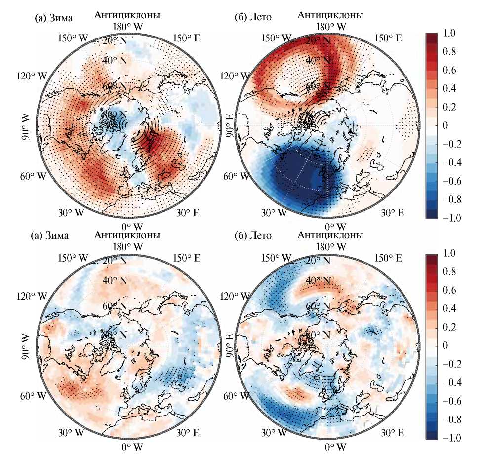 Для интенсивных летних антициклонов над океанами отмечены области как с положительной, так и отрицательной статистически значимой корреляцией с приповерхностной температурой. Для зимних сезонов над Атлантическим океаном проявляется чередование областей со значимой корреляцией повторяемости интенсивных антициклонов с приповерхностной температурой – отрицательной над Северной Америкой и восточной Европой и положительной над Тихим океаном. Относительно небольшие области со значимой отрицательной корреляцией отмечены над континентальными регионами, в частности в районе озера Байкал и над Тихим океаном.