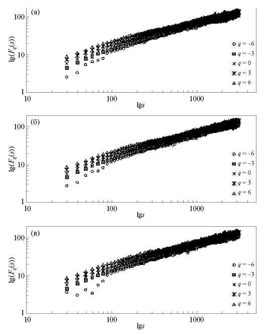 Рис. 1. Зависимость флуктуационной функции Fq(s) для моментов q = –6, –3, 0, 3, 6 от s в логарифмическом масштабе для временных рядов минимальной (а), максимальной (б) и средней температуры (в).