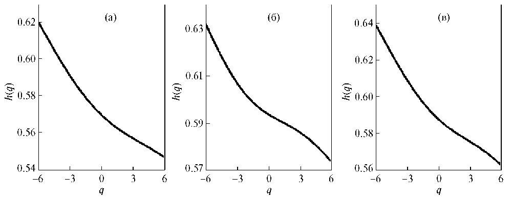 Для мультифрактальных рядов h(q) является нелинейной функцией: при положительных q основной вклад в функцию Fq(s) дают сегменты, проявляющие большие отклонения F2(s), а при отрицательных q доминируют сегменты с малыми дисперсиями F2(s). Таким образом, при отрицательных значениях q обобщенный показатель Херста h(q) описывает сегменты, проявляющие малые флуктуации, а при положительных – большие.