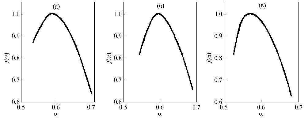 На рис. 3 представлены спектры сингулярности в зависимости от показателя “частоты” сингулярности (показатель Гельдера) для временных рядов минимальной, максимальной и средней температуры. Данные на рис. 3 показывают, что спектры сингулярности вариаций минимальной, максимальной и средней температуры имеют левое усечение и длинный правый хвост. Это связано с мультифрактальной структурой рассматриваемых временных рядов, нечувствительной к локальным флуктуациям большой величины. Максимальное значение f(α) соответствует q = 0, тогда как значения f(α) слева от него соответствуют положительным значениям q и, аналогично, значения f(α) справа от максимума соответствуют отрицательным значениям q. Из рис. 3 следует, что f(α) незначительно изменяется слева от своего максимального значения (положительные значения q) и, наоборот, существенно изменяется справа от своего максимума (отрицательные значения q). Кроме того, диапазон минимального и максимального значений параметра а характеризует степень мультифрактальности временного ряда; диапазон больше справа от максимума f(α), что означает, что существует более высокая степень мультифрактальности для отрицательного q, подтверждая таким образом результаты масштабного поведения Fq(s) и распределение обобщенного показателя Херста h(q) (рис. 1 и 2 соответственно).