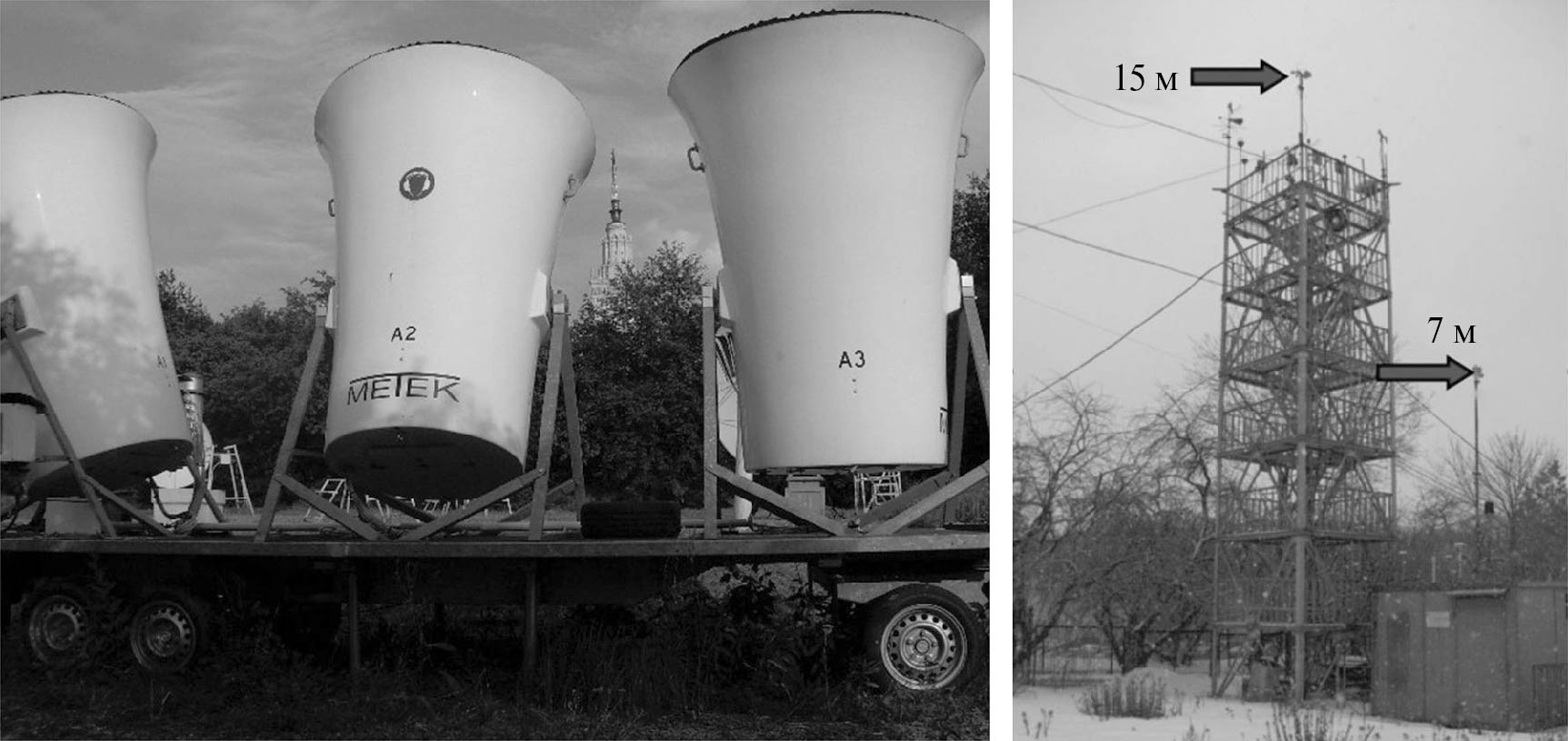 Рис. 1. Антенная система доплеровского содара MODOS (слева) и анемометрическая вышка с датчиками ветра (справа) в Метеорологической обсерватории МГУ. Стрелками показаны анемометры на двух высотах.