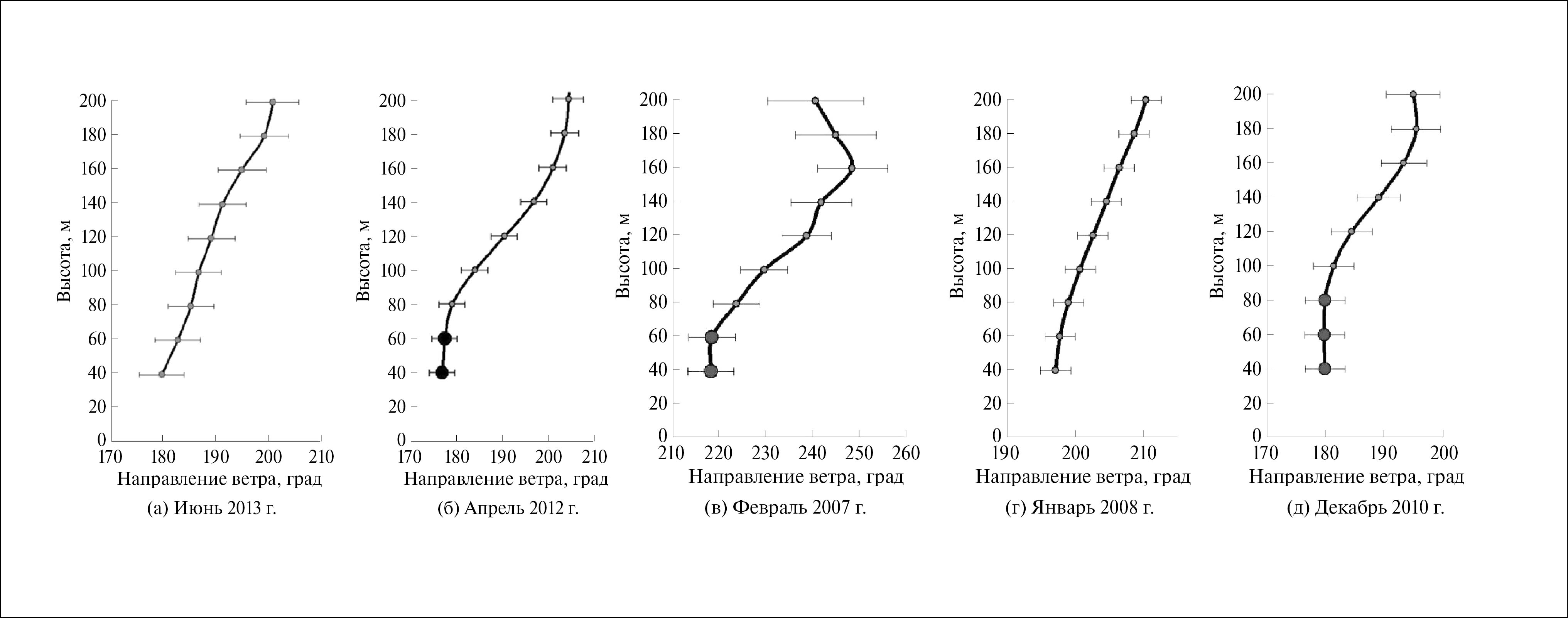 Наиболее показательные примеры полученных профилей направления ветра приведены на рис. 3. Как видим, в ряде случаев в нижней их части прослеживается участок с почти одинаковым направлением с точностью до ±1°, отмеченный жирными кружками. Как правило, такой участок охватывает лишь первый промежуток между двумя нижними уровнями измерений вплоть до 60 м (рис. 3б, в), хотя иногда достигает 80 м (рис. 3д). Один раз, в октябре 2006 г., он прослеживался даже вплоть до 100 м. Однако в большинстве случаев (приблизительно в двух из трех) изменение направления в сторону роста его значений, то есть правый поворот, наблюдается уже в самом нижнем интервале высот от 40 до 60 м (рис. 3а, 3г). Полученные результаты можно интерпретировать в качестве данных о высоте приземного слоя H, поскольку участок с приблизительно постоянным направлением, если он был, всегда наблюдался в нижней части диапазона, а поворот в среднем за месяц всегда оказывался правым, в соответствии с классической “спиралью Экмана” – во всяком случае, в нижней части слоя Экмана. Исключением служит лишь средний левый поворот в слое выше 160 м на рис. 3в). Вероятно, он отражает особенности барического поля и направления термического ветра в феврале 2007 г. Заметим, что среднее за отдельные месяцы направление ветра заключено в пределах от южного до юго-западного в приземном слое и от южно-юго-западного до западно-юго-западного на высоте 200 м. Это подтверждает наличие главной юго-западной моды в многолетней розе ветров по данным содара MODOS во всем диапазоне зондирования [Локощенко, 2015]. Средняя величина правого поворота ветра в приведенных на рис. 3 примерах в слое воздуха до 200 м составляет от 15˚ до 20˚, что также подтверждает среднюю многолетнюю оценку этой величины для условий Москвы: ~20˚ [Локощенко, 2015].