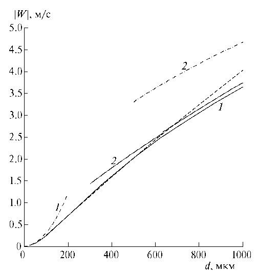 которое легко решается относительно Re численными методами (например, методом половинного деления) при заданных значениях диаметра капли d и параметра γ. Затем из найденного значения Re определяется искомое значение установившейся скорости капли (по абсолютной величине) . Задавая различные значения диаметра капли (при фиксированном γ), из (9) можно получить зависимость от d. График данной зависимости, полученный указанным путем для капли дождя в атмосферном воздухе при нормальных условиях, показан на рис. 1 (сплошная кривая 1). Штрихпунктирные кривые 1, 2 соответствуют стоксовому и ньютоновому предельным режимам обтекания капли, рассчитанные по формулам (7), (8). Для сравнения штриховой линией представлены экспериментальные результаты [Mason, 1971]. Видно, что стоксово приближение удовлетворительно описывает расчетную зависимость при d ≤ 100 мкм. Ньютоново приближение в пределах d ≤ 1000 мкм дает завышенные значения скорости осаждения капли. Расчетные скорости капли хорошо согласуются с данными опытов для диаметров капли d ≤ 600 мкм, однако с ростом размера капли различие между ними увеличивается и достигает ~10% при диаметре капли 1000 мкм. Согласие между экспериментальными и расчетными значениями скорости капли свидетельствует о правомерности используемой формулы для коэффициента сопротивления. На рис. 1 также построен график зависимости установившейся скорости осаждения капли по приближенно-аналитической формуле [Ингель, 2012], справедливой для больших чисел Рейнольдса (сплошная кривая 2). Видно, что расчетная и приближенно-аналитическая зависимости хорошо согласуются между собой (особенно для относительно крупных капель).