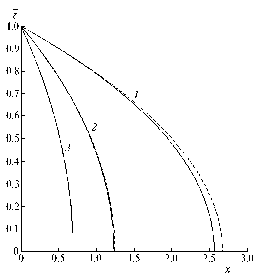 Опираясь на общую теорию сингулярно возмущенных уравнений [Ракитский и др., 1979], остановимся на некоторых особенностях поведения решений уравнений (10)–(12). В рассматриваемой области изменения времени выделяются два отрезка с существенно различным поведением решений, причем продолжительность первого значительно меньше второго. На первом отрезке скорость капли быстро стремится к стационарной скорости, а на втором отрезке она практически не меняется. При этом чем меньше величины и , тем быстрее сближаются интегральные кривые уравнений (10)–(12) к соответствующим значениям (в стоксовом и ньютоновом режимах к и = ‒1, а в промежуточном режиме к значению, рассчитанному по (9) и отнесенному к ). Различный характер поведения решений на обоих участках проявляется тем отчетливее, чем меньше параметры , . Из уравнений (10)–(12) также следует, что ускорение капли в начальный момент времени в стоксовом режиме равно 1/, а в промежуточном и ньютоновом режимах движения равно 1/.