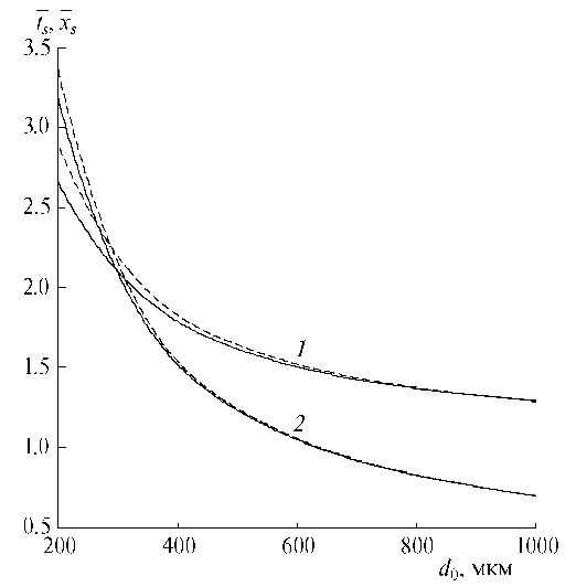 Рис. 4. Зависимости полного времени падения и дальности пролета капли от ее размера: 1 – , 2 – .
