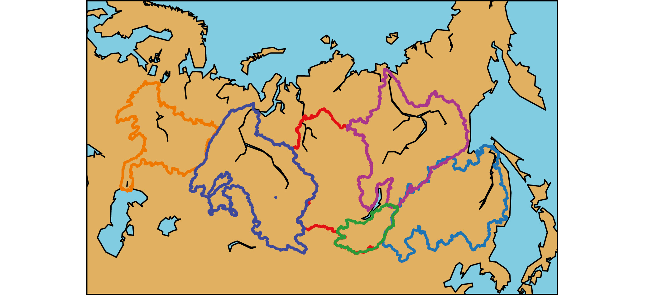 Рис. 1. Границы водосборов рек, сток которых анализируется в данной работе: Волга (оранжевая линия), Обь (синяя), Енисей (красная), Лена (фиолетовая), Амур (голубая), Селенга (зеленая).