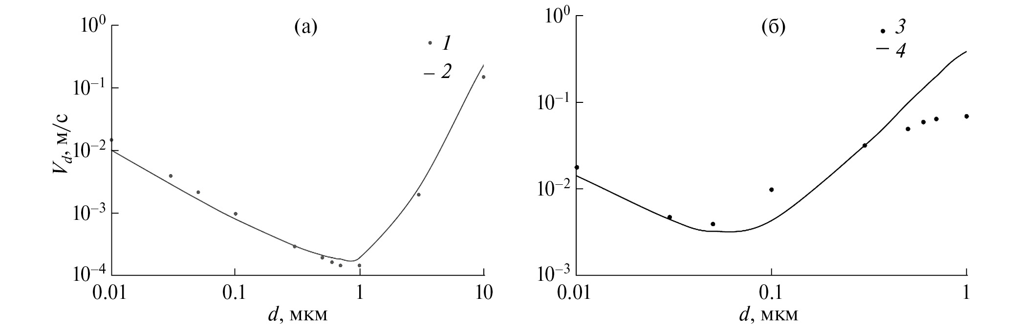 Рис. 3. Результаты оценки скорости сухого осаждения Vd аэрозольных частиц на водную (а) и покрытую снегом поверхности (б), полученные при условиях: 2, 4 – расчет по формуле (7), 1, 3 – данные из [Giardina et al., 2018] при u* = = 0.10 и 0.14 м/с соответственно.