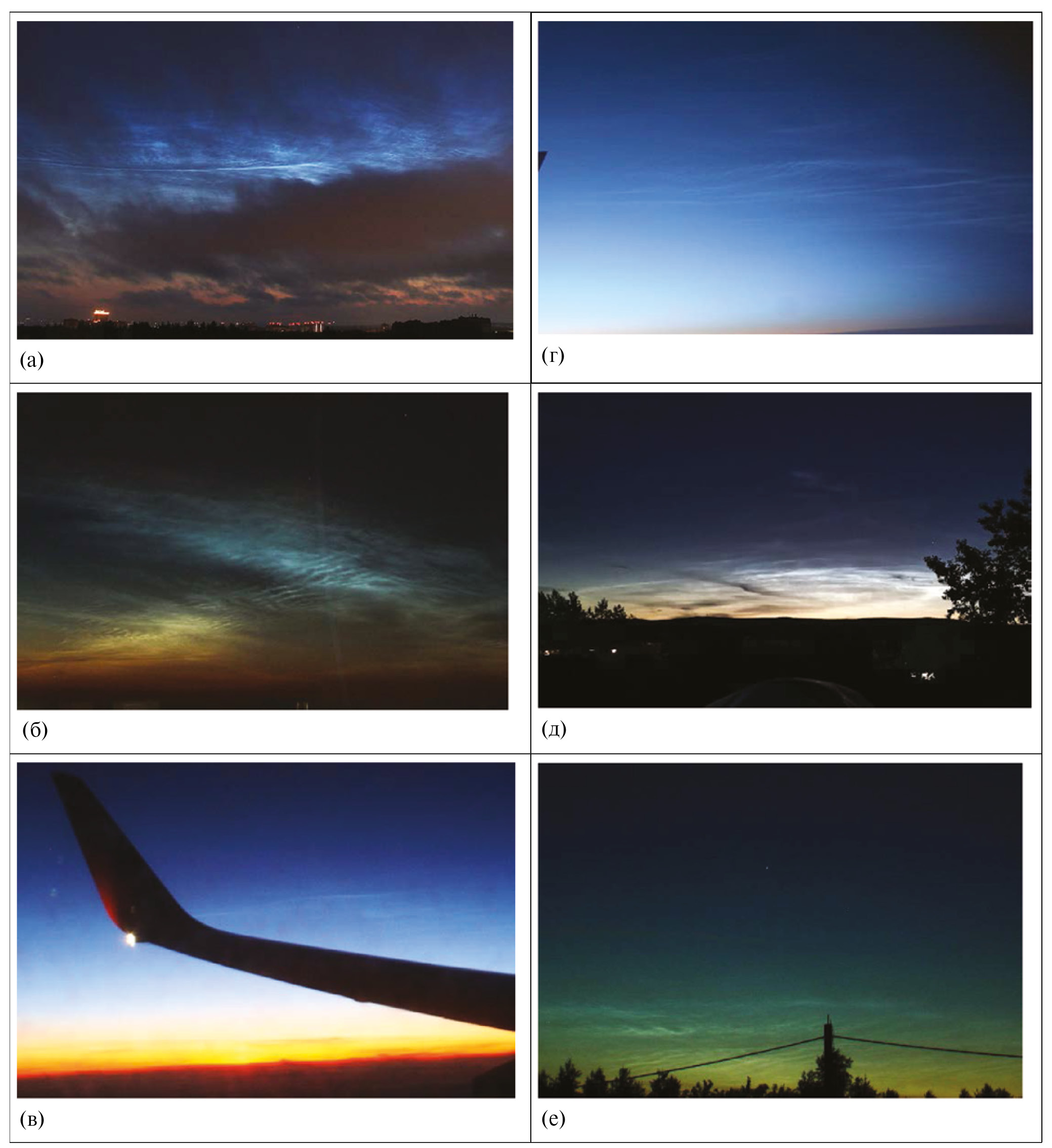 В настоящей работе использовались данные наземной сети автоматической фотосъемки серебристых облаков [Dalin и др., 2008; Dubietis и др., 2011], которая в период 13–22 июня 2021 г. включала в себя следующие пункты (здесь перечислены только пункты в Российской Федерации и Северной части Казахстана, с запада на восток): Обнинск (55˚ с.ш., 37˚ в.д.), Красногорск (56˚ с.ш., 37˚ в.д.), Заволжск (57˚ с.ш., 42˚ в.д.), Казань (56˚ с.ш., 49˚ в.д.), Петропавловск (55˚ с.ш., 69˚ в.д.), Новосибирск (55˚ с.ш., 83˚ в.д.). На возможность обнаружения С.О. по данным наземных фотокамер влияли локальные погодные условия, различные в разных пунктах. Использовались также фотоснимки и записи отдельных наземных наблюдателей, в том числе и собранные на сайте meteoweb (http://meteoweb.ru/astro/nlc/map.php?date=2021-6-13, http://meteoweb.ru/astro/nlc/map.php?date=2021-6-21), самолетные наблюдения и съемка с пассажирского самолета (ПС) во время ночных авиарейсов Москва–Иркутск 13/14 июня и Иркутск–Москва 21/22 июня. Примеры наземных и самолетных фотоизображений С.О. даны на рис. 1. Поскольку бόльшая часть обоих полетов проходила выше тропосферных облаков, результаты самолетных наблюдений менее зависели от погодных условий, однако движение ПС относительно солнечного терминатора налагало другие ограничения. При полете на восток ПС довольно быстро пролетел весь ночной сектор пути (ночной участок выше тропосферных облаков продолжался 1 ч 23 мин), перекрывая при этом сравнительно небольшой участок (19˚) долгот, где было возможно наблюдение С.О. по световым условиям. Быстрому окончанию сумерек способствовало постепенное смещение ПС к северу до 59.6˚ с.ш. При полете на запад ПС перемещался приблизительно со скоростью солнечного терминатора, так что производился разрез большого интервала долгот (63˚) фактически при фиксированном местном солнечном времени (LST) 21 ч 50 мин ÷ 22 ч 15 мин. Соответствующая длительность по UT (выше тропосферных облаков) составила 4 ч 42 мин. При этом эволюция облачных полей относительно местного времени оставалась не наблюдаемой с ПС, но было возможно проследить эту эволюцию относительно всемирного времени. Отслеживание пространственно-временных координат ПС осуществлялось при помощи международного авиационного архива Flight Aware https://ru.flightaware.com/live/flight/AFL1442/history/20210613/1825Z/UUEE/UIII/tracklog, https://ru.flightaware.com/live/flight/AFL1565/history/20210621/1435Z/UIII/UUEE/tracklog.