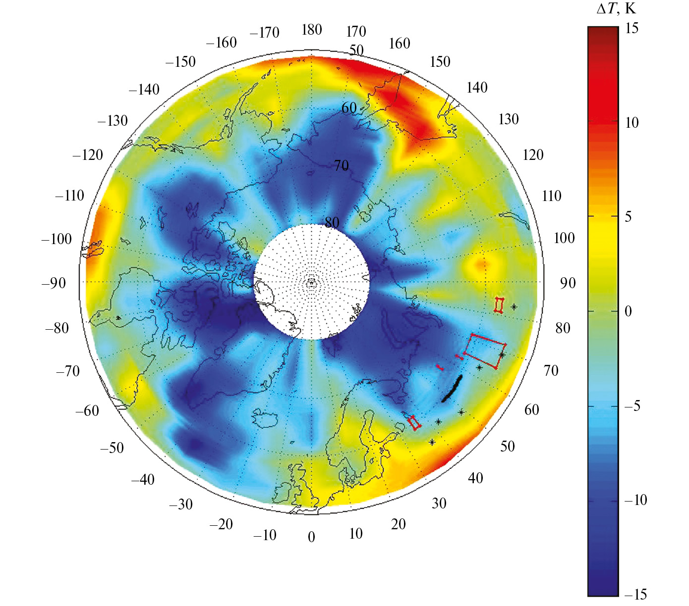Рис. 2. Зафиксированные наземной и самолетной фотосъемкой 13 июня 2021 г. (UT 17:00÷23:30) поля С.О. (красные прямоугольники) на фоне карты разностей температуры и точки замерзания на барическом уровне 0.0046 гПа (~85 км), построенной по данным прибора MLS спутника Aura. Наземные пункты, где наблюдались С.О. либо отмечено их отсутствие при благоприятных погодных условиях, показаны черными звездочками. Часть траектории ПС, проходившая в сумеречных или ночных условиях выше тропосферной облачности, показана жирной черной линией.