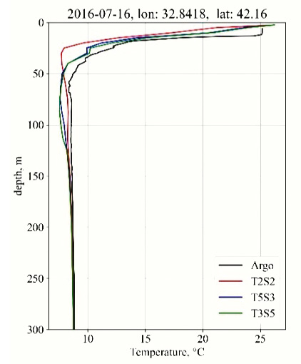 Наиболее важные на наш взгляд различия, обнаруженные в результатах моделирования поля температуры, – это толщина сезонного термоклина и толщина ХПС. В центральной части моря в экспериментах T3S5 и T5S3 с середины июня по конец сентября слой скачка температуры и слой ХПС тоньше, чем в T2S2. В качестве примера на рис. 7а показаны вертикальные разрезы температуры вдоль 43˚ с.ш. в июле. Как видно в окрестностях горизонта 25 м наблюдается сгущение изотерм в расчетах T3S5 и T5S3, а толщина ХПС в среднем менее 50 м. Анализ натурных данных за 2016–2019 гг. [Морозов и др., 2020] показывает, что в Черном море наблюдается поднятие нижней границы ХПС. По сведениям, представленным в монографии [Иванов и др., 2011], максимальная величина среднего для летнего сезона вертикального градиента температуры, характеризующего слой скачка, равна –1.4˚С/м. Средние за июль оценки величины вертикального градиента модельной температуры в слое 20–25 м для глубоководной части моря (мористее изобаты 1500 м) составляют –1.03, –1.23, –1.34˚С/м для первого, второго и третьего экспериментов соответственно. Анализ профилей температуры по данным ARGO (рис. 7б, в) и глубоководных станций рейса № 87 НИС “Профессор Водяницкий” (рис. 7г) вблизи 43˚ с.ш. указывает на то, что эксперименты T3S5 и T5S3 качественно и количественно точнее воспроизводят форму и толщину ХПС. Как видно из рис. 7б–г результаты расчетов T3S5 и T5S3 находятся в лучшем соответствии с наблюдениями в слое 25–50 м.