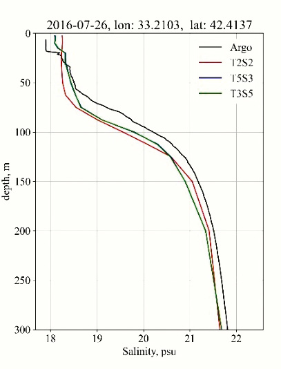 Как было показано выше, значимые отличия в результатах моделирования температуры и солености наблюдаются в верхнем 300-метровом слое. Анализ пространственных распределений поля солености на различных горизонтах показал, что разница в интенсивности циркуляции проявляется начиная с глубин примерно 75 м с конца весны. В экспериментах T3S5 и T5S3 в центральной части моря наблюдаются области повышенной солености по сравнению с T2S2 (рис. 5а), что свидетельствует об усилении подъема вод. Такая картина прослеживается до конца осени. Из рис. 1б видно, что летом в глубоководной части моря находились буи ARGO № 6901831 и 6901900. Для восточной части моря сопоставление с данными буя 6901831, двигавшегося на северо-восток, демонстрирует уменьшение ошибки в результатах экспериментов T3S5 и T5S3 (рис. 5б), когда буй переместился севернее 43˚ с.ш. в область с наибольшей разницей между экспериментами (рис. 5а). Так, анализ разницы между модельными и натурными данными для лета 2016 г. показал, что величины mean S составили 1.36, 1.22, 1.25‰ для экспериментов T2S2, T3S5, T5S3 соответственно. Отклонение солености вдоль траектории буя 6901900 свидетельствует, что в западной части моря (рис. 1а) эксперимент T3S5 дает наименьшую ошибку (рис. 5в): величины mean S составили 1.62, 1.28, 1.57‰ для экспериментов T2S2, T3S5, T5S3 соответственно. Профили солености вдоль траекторий буев демонстрируют, что уменьшение ошибки моделирования солености в центральной части связано с более точным воспроизведением верхней границы основного галоклина в экспериментах T3S5 и T5S3 (рис. 5г, д).