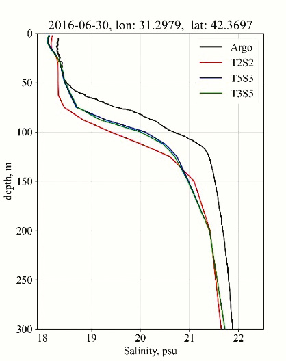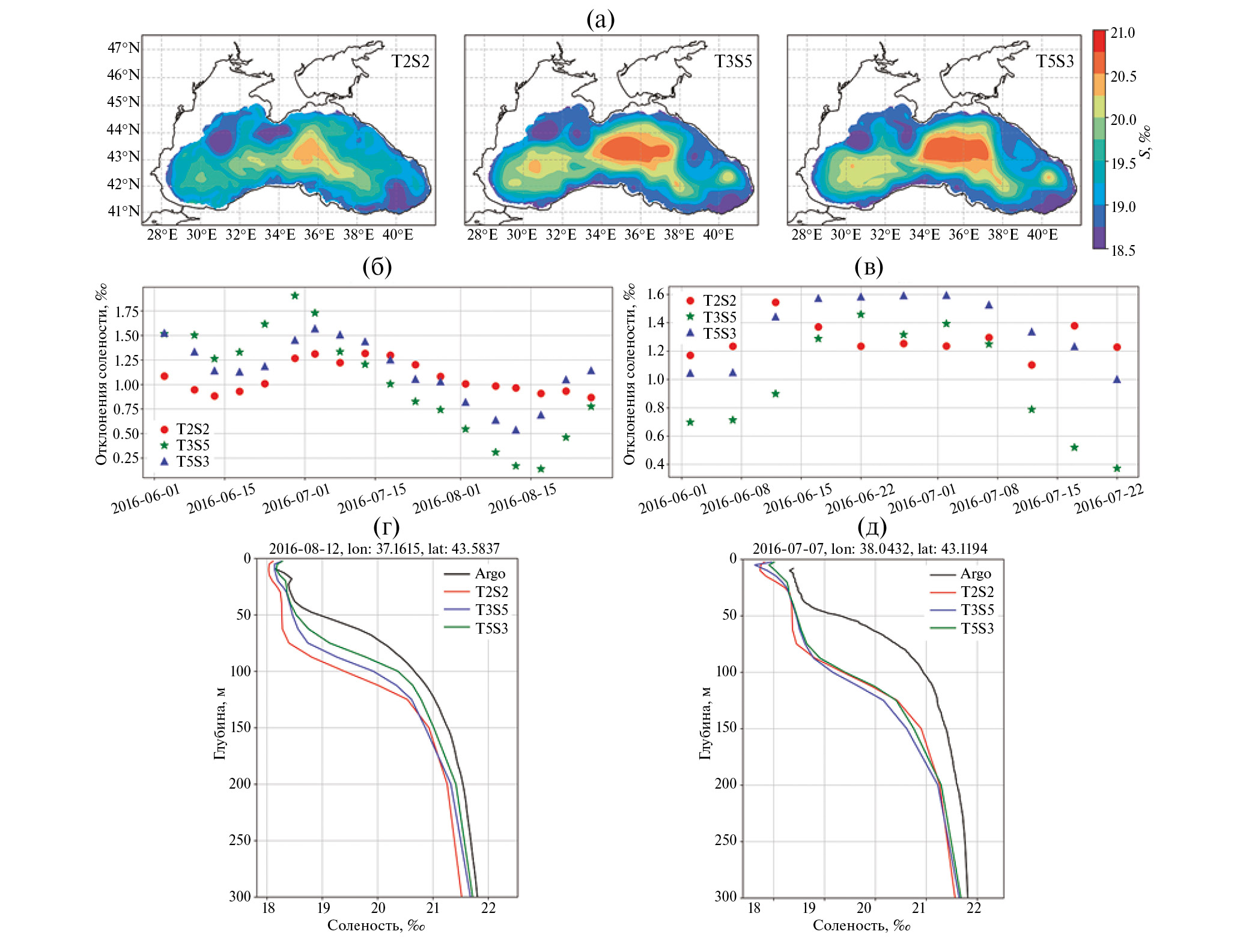 Как было показано выше, значимые отличия в результатах моделирования температуры и солености наблюдаются в верхнем 300-метровом слое. Анализ пространственных распределений поля солености на различных горизонтах показал, что разница в интенсивности циркуляции проявляется начиная с глубин примерно 75 м с конца весны. В экспериментах T3S5 и T5S3 в центральной части моря наблюдаются области повышенной солености по сравнению с T2S2 (рис. 5а), что свидетельствует об усилении подъема вод. Такая картина прослеживается до конца осени. Из рис. 1б видно, что летом в глубоководной части моря находились буи ARGO № 6901831 и 6901900. Для восточной части моря сопоставление с данными буя 6901831, двигавшегося на северо-восток, демонстрирует уменьшение ошибки в результатах экспериментов T3S5 и T5S3 (рис. 5б), когда буй переместился севернее 43˚ с.ш. в область с наибольшей разницей между экспериментами (рис. 5а). Так, анализ разницы между модельными и натурными данными для лета 2016 г. показал, что величины mean S составили 1.36, 1.22, 1.25‰ для экспериментов T2S2, T3S5, T5S3 соответственно. Отклонение солености вдоль траектории буя 6901900 свидетельствует, что в западной части моря (рис. 1а) эксперимент T3S5 дает наименьшую ошибку (рис. 5в): величины mean S составили 1.62, 1.28, 1.57‰ для экспериментов T2S2, T3S5, T5S3 соответственно. Профили солености вдоль траекторий буев демонстрируют, что уменьшение ошибки моделирования солености в центральной части связано с более точным воспроизведением верхней границы основного галоклина в экспериментах T3S5 и T5S3 (рис. 5г, д).
