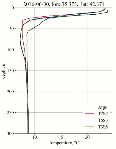 Наиболее важные на наш взгляд различия, обнаруженные в результатах моделирования поля температуры, – это толщина сезонного термоклина и толщина ХПС. В центральной части моря в экспериментах T3S5 и T5S3 с середины июня по конец сентября слой скачка температуры и слой ХПС тоньше, чем в T2S2. В качестве примера на рис. 7а показаны вертикальные разрезы температуры вдоль 43˚ с.ш. в июле. Как видно в окрестностях горизонта 25 м наблюдается сгущение изотерм в расчетах T3S5 и T5S3, а толщина ХПС в среднем менее 50 м. Анализ натурных данных за 2016–2019 гг. [Морозов и др., 2020] показывает, что в Черном море наблюдается поднятие нижней границы ХПС. По сведениям, представленным в монографии [Иванов и др., 2011], максимальная величина среднего для летнего сезона вертикального градиента температуры, характеризующего слой скачка, равна –1.4˚С/м. Средние за июль оценки величины вертикального градиента модельной температуры в слое 20–25 м для глубоководной части моря (мористее изобаты 1500 м) составляют –1.03, –1.23, –1.34˚С/м для первого, второго и третьего экспериментов соответственно. Анализ профилей температуры по данным ARGO (рис. 7б, в) и глубоководных станций рейса № 87 НИС “Профессор Водяницкий” (рис. 7г) вблизи 43˚ с.ш. указывает на то, что эксперименты T3S5 и T5S3 качественно и количественно точнее воспроизводят форму и толщину ХПС. Как видно из рис. 7б–г результаты расчетов T3S5 и T5S3 находятся в лучшем соответствии с наблюдениями в слое 25–50 м.
