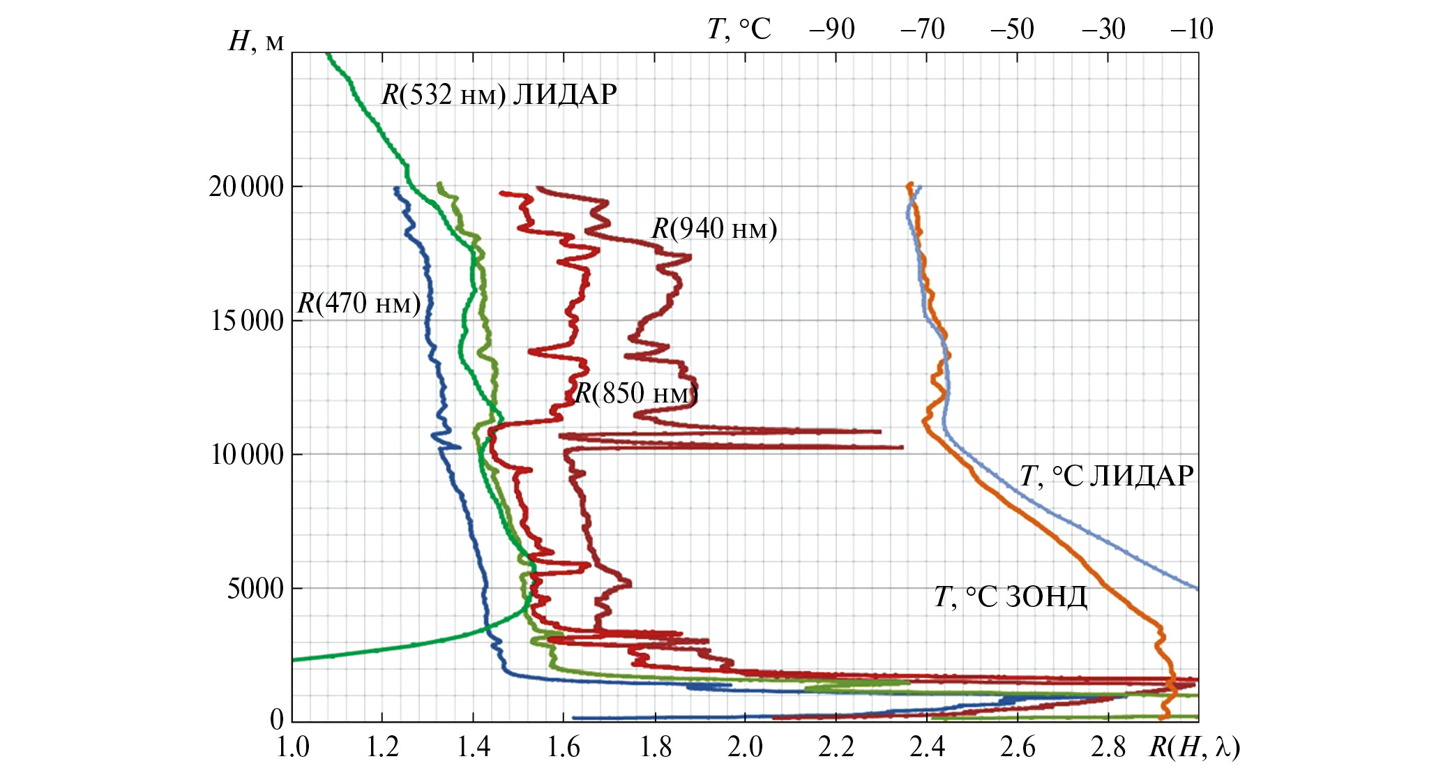 где β(λ,Н), βМ(λ,Н), βА(λ,Н) – коэффициенты полного, молекулярного и аэрозольного обратного рассеяния света на длине волны λ на высоте Н. Для примера, выполнение условий R(λ,H) = 1 означает отсутствие на данных высотах аэрозоля, и наоборот, там, где R(λ,H) > 1, появляется аэрозоль. По значению R(λ,H) определяется вклад аэрозольного рассеяния по отношению к молекулярному. На рис. 1 приведены вертикальные профили R(λ,H) для длин волн 355 м 532 нм (лидар) и для длин волн 470, 528, 850 и 940 нм (АЗОР), демонстрирующие наглядную картину аэрозольного наполнения тропосферы и стратосферы. Профиль вертикального распределения плотности рассчитывался по измеренным данным температуры атмосферы с использованием барометрической формулы Лапласа–Рюльмана. Рисунок 1 демонстрирует, что зачастую доля аэрозольного рассеяния довольно трудно выделяется на фоне молекулярного рассеяния и многоканальность очевидным образом повышает надежность интерпретации данных.