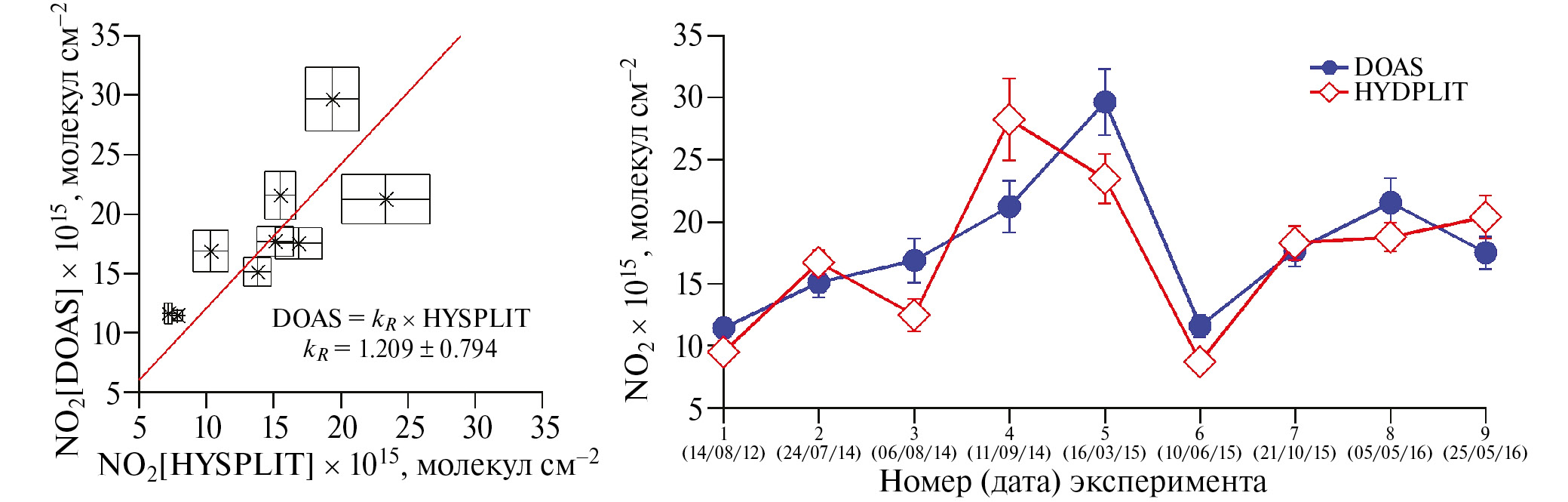 Рис. 5. Сопоставление средних значений содержания NO2 в шлейфе городского загрязнения, полученных для каждого из мобильных экспериментов по данным DOAS-измерений и результатам расчетов HYSPLIT в 2012 и 2014–2016 гг. (слева). Справа представлена вариация среднего значения измеренного содержания NO2 от эксперимента к эксперименту, в сравнении с данными моделирования, приведенными к результатам измерений (используя коэффициент линейной регрессии kR на графике слева).