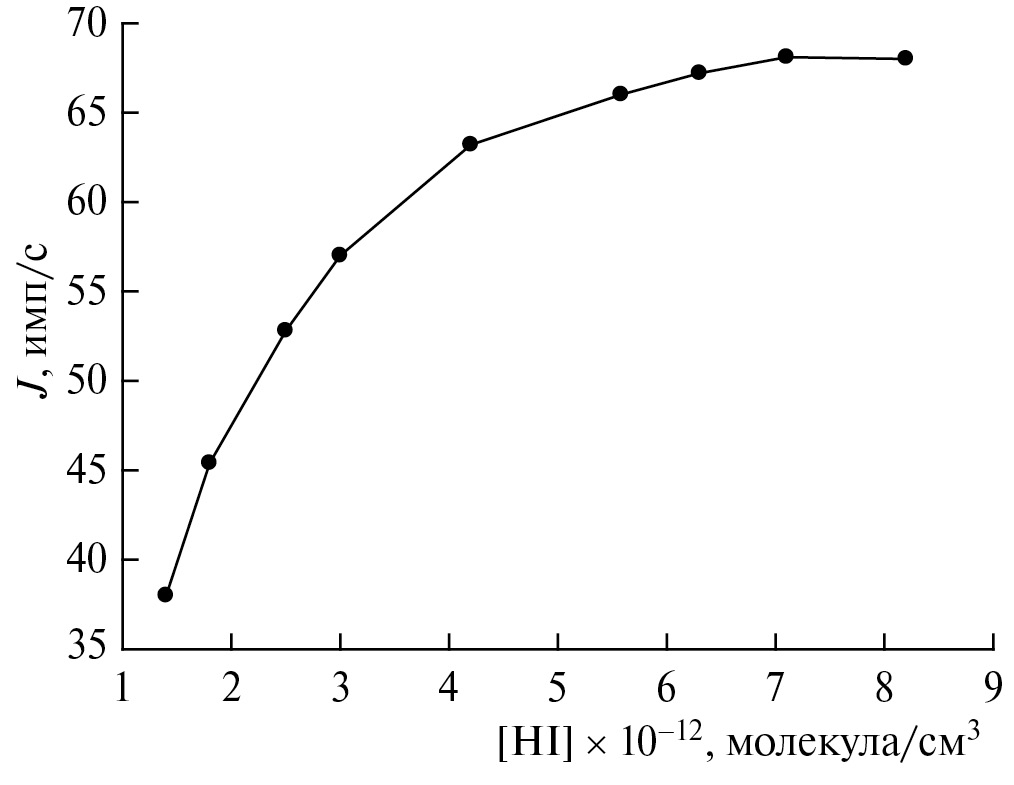 Рис. 5. Зависимость от концентрации HI при фиксированном времени взаимодействия реагентов (0.0073 с). (T = 298˚K; P = 1.1 Торр. Разбавителем служил гелий. Измерялся РФ сигнал атомов йода.)