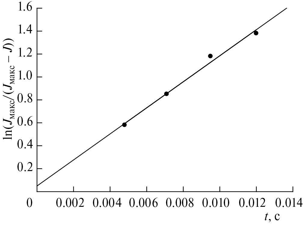 Зависимость ln (J0 /J) от времени взаимодействия представлена на рис. 2.