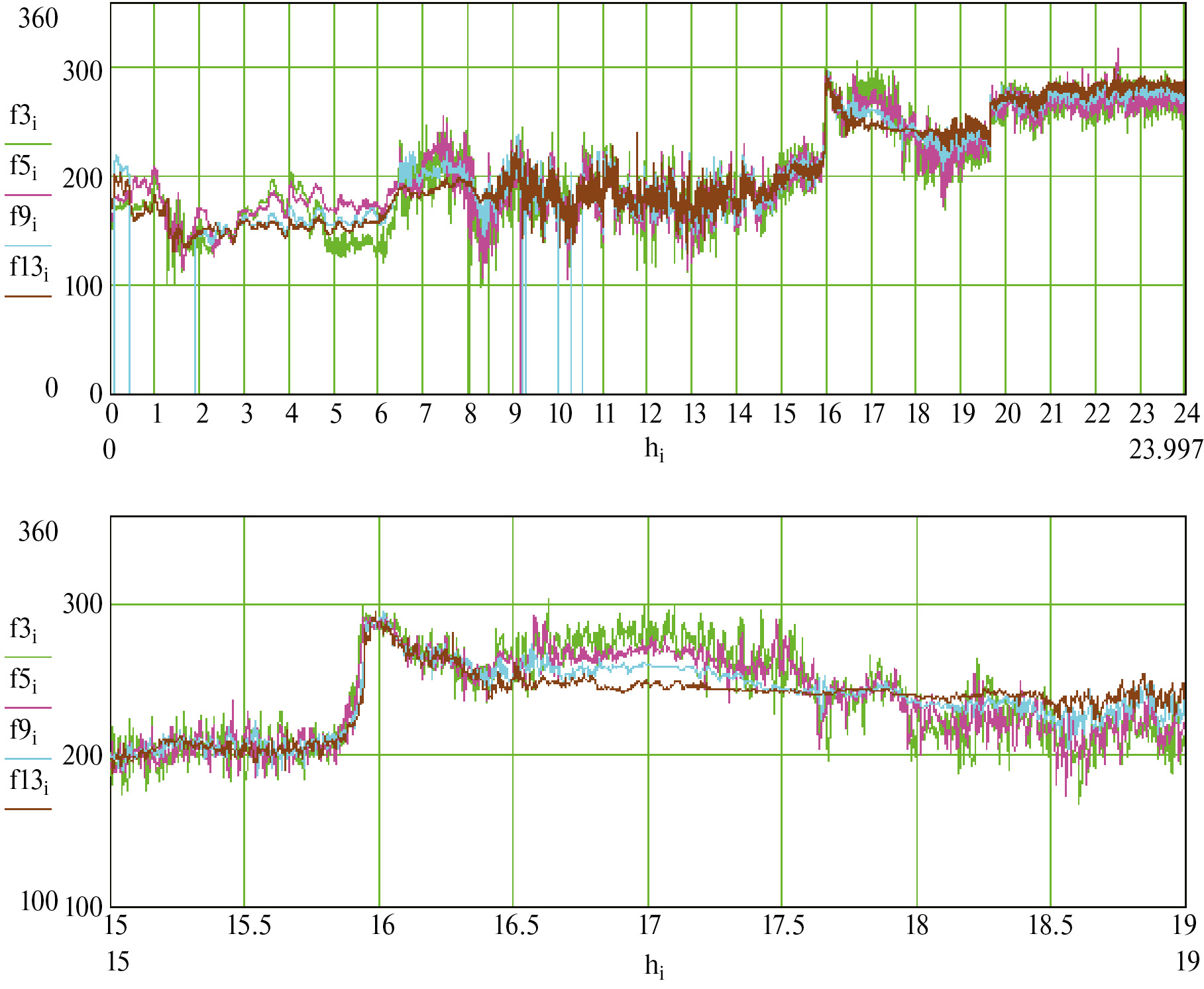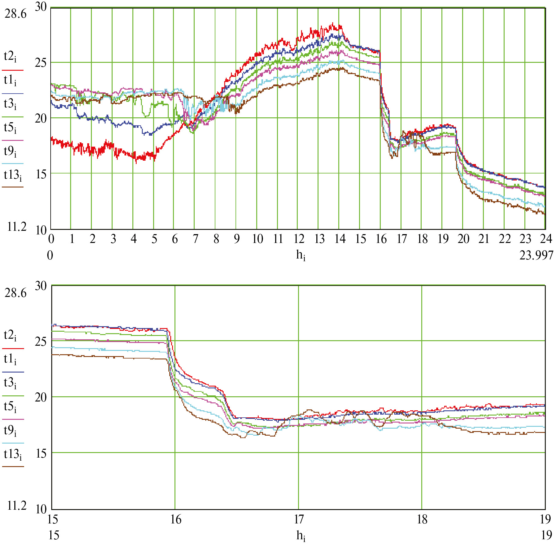 5. Рис. 4. Температура воздуха (°C) на шести высотах в течение суток. По оси Х – час суток t2 – температура на высоте 2 м; t1 – температура на высоте 25 м; t3 – температура на высоте 73 м; t5 – температура на высоте 121 м; t9 – температура на высоте 217 м; t13 – температура на высоте 301 м.