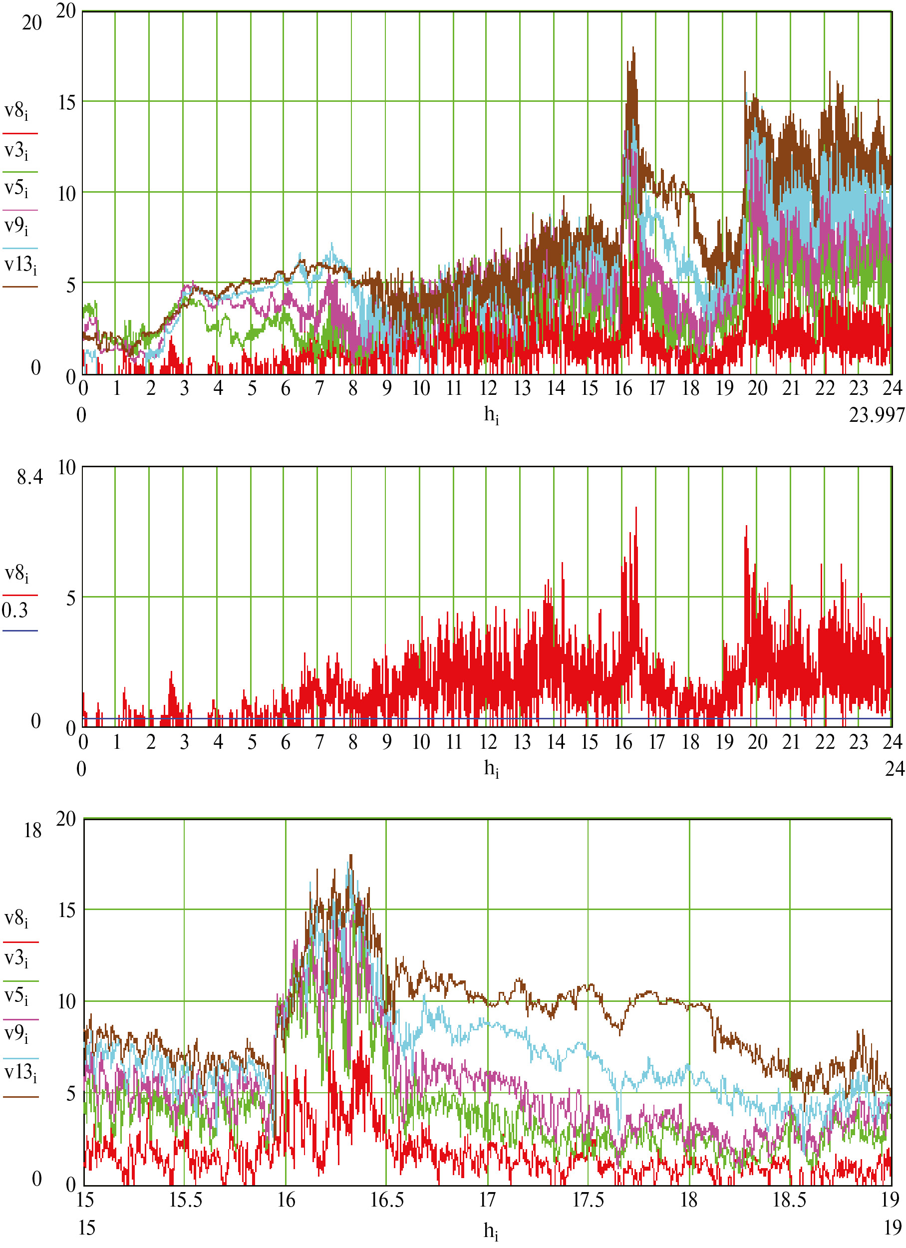 8. Рис. 7. Скорость ветра (м/с) на пяти высотах. v8 – скорость ветра на высоте 8 м. Остальные высоты те же, что для температуры воздуха (см. рис. 4).
