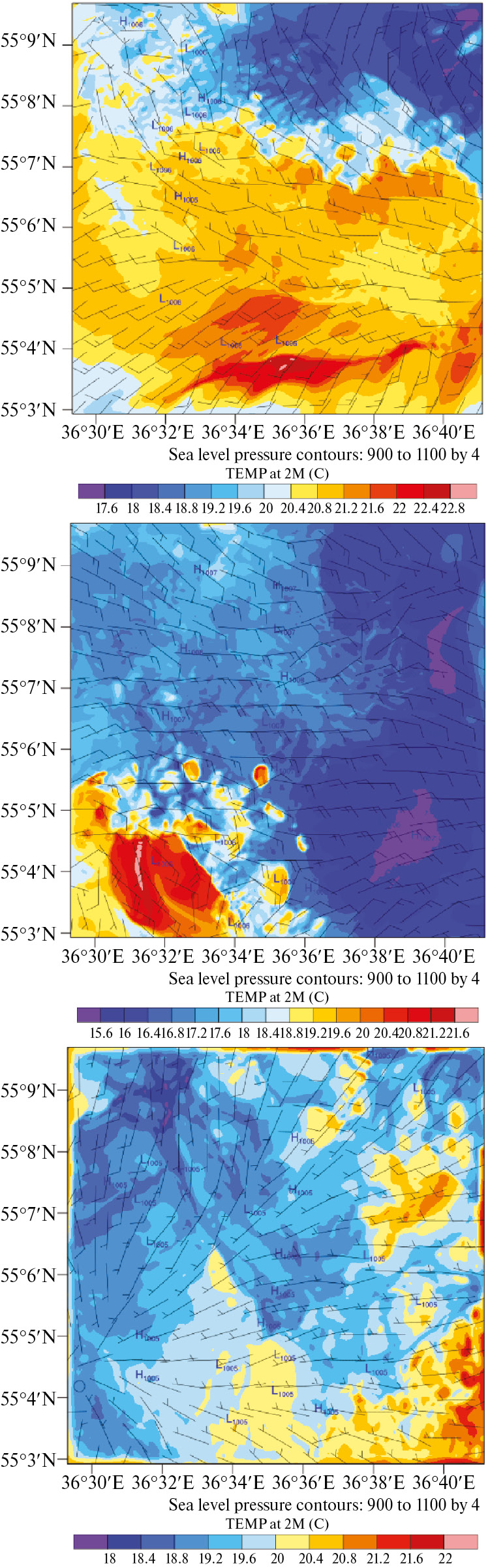 14. Рис. 13. Температура и ветер на высоте 2 м, атмосферное давление на уровне моря – для 12:00(а),13:00(б),14:00(в) ВСВ; над районом измерений, вид сверху. ВММ располагается в центре области, координаты 55°06′42″ с. ш. 36°35′54″ в. д. Атмосферное давление на уровне моря показано цифрами синим цветом рядом с указаниями локальных минимумов и максимумов давления L и H. Модифицированная модель WRF, 4 июля 2016 г. Шаг сетки 60 м.