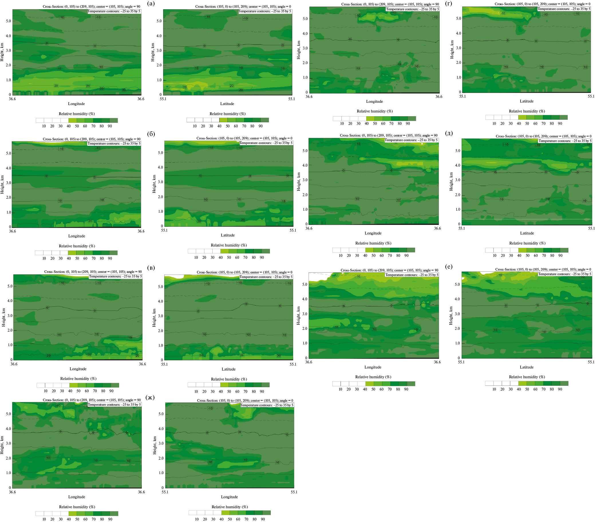Рис. 15. Распределение влажности и температуры по высоте – для 13:00(а), 13:10(б), 13:20(в), 13:30(г), 13:40(д), 13:50 (е), 14:00(ж) ВСВ; над районом измерений, рисунок слева показывает разрез по широте, рисунок справа – по долготе. Координаты ВММ 55°06′42″ с. ш. 36°35′54″ в. д.. Модифицированная модель WRF, 4 июля 2016 г. Шаг сетки 20 м.