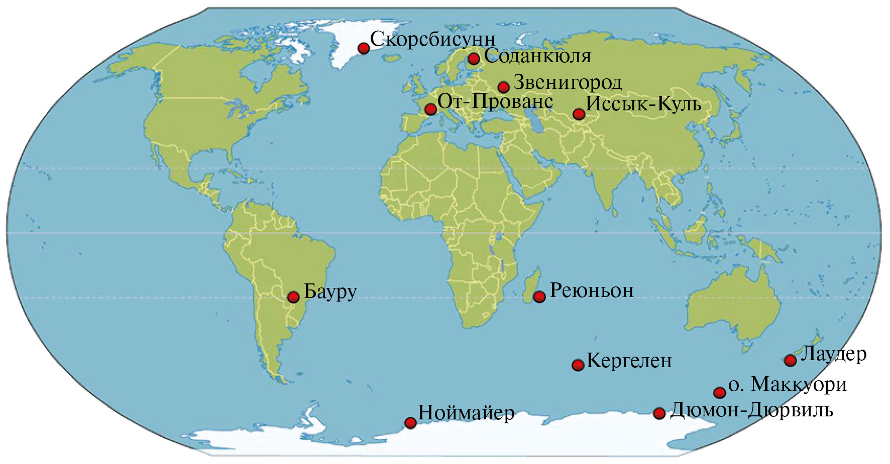 Рис. 1. Расположение станций NDACC с измерениями содержания NO₂ сумеречным методом.