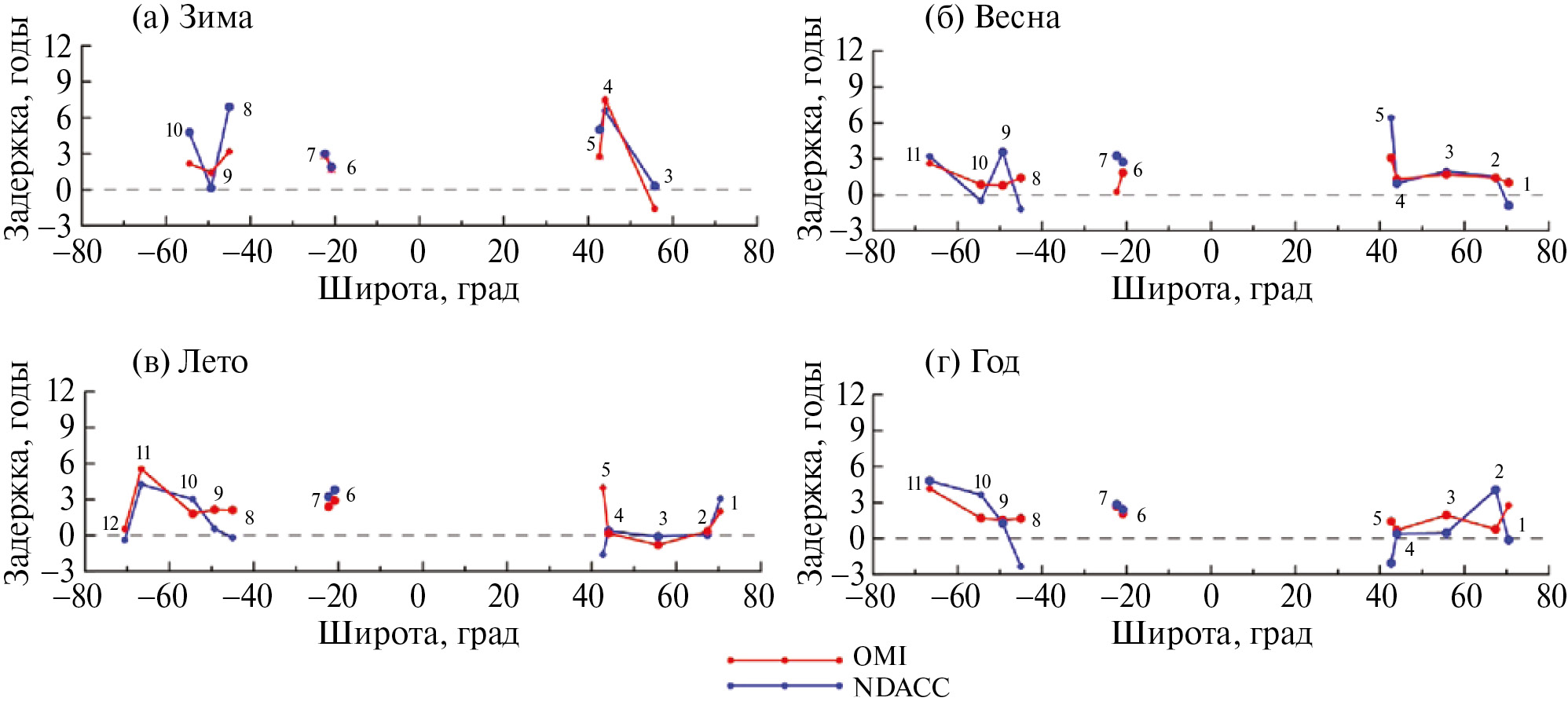 Рис. 5. Задержка зимнего (а), весеннего (б), летнего (в) и годового (г) откликов стратосферного содержания NO₂ по данным OMI (красный цвет) и общего (для ст. Звенигород – стратосферного) содержания NO₂ по наземным данным (синий цвет) на воздействие 11-летнего цикла солнечной активности в зависимости от широты. Номера станций соответствуют столбцу 1 таблицы.