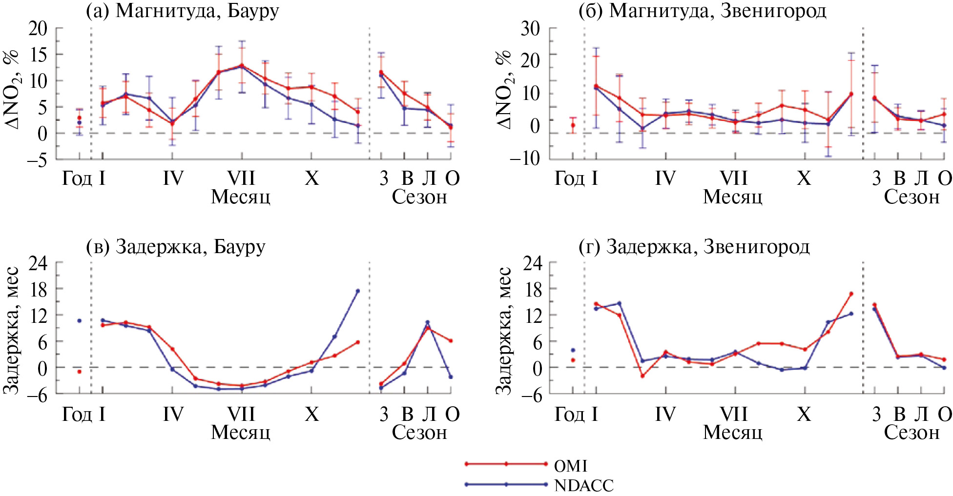Рис. 6. (а–б): Годовая (левая часть), месячные (средняя часть) и сезонные (правая часть графиков) оценки размаха колебаний стратосферного содержания NO₂ по данным OMI (красный цвет) и общего (для ст. Звенигород – стратосферного) содержания NO₂ по наземным данным (синий цвет) на ст. Бауру (а) и Звенигород (б) под действием экваториальной КДЦ. Вертикальные отрезки – 95% доверительные интервалы. (в–г): Задержка квазидвухлетних колебаний NO₂ на ст. Бауру (в) и Звенигород (г) относительно колебаний скорости экваториального ветра на уровне 40 гПа.