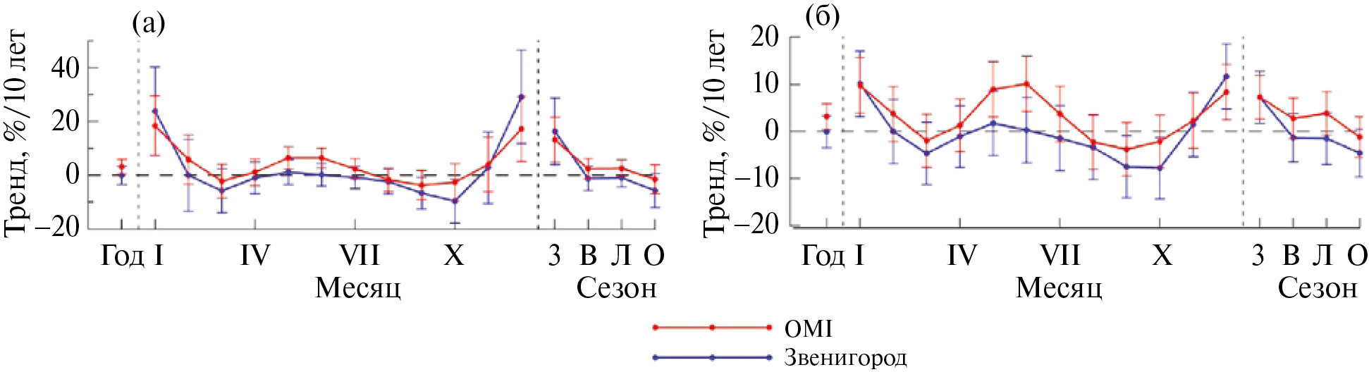 Сезонно-зависимые оценки трендов стратосферного содержания NO₂ при обычной нормировке (на среднемесячные, среднесезонные и среднегодовые значения содержания NO₂) приведены на рис. 10а. Максимальные тренды выявлены зимой (до 20–30% за 10 лет в декабре-январе при сезонных оценках 17–18% за 10 лет). Согласие между спутниковыми и наземными оценками получено для всех четырех сезонов. Однако годовые оценки не согласуются между собой: по данным OMI отмечен тренд 3% за 10 лет, но по наземным данным годовой тренд не выявлен. Основная причина расхождения годовых оценок раскрывается на рис. 10б, где значения трендов приведены при нормировке на одно и то же значение – среднегодовое содержание NO₂. Высокие положительные значения трендов 10% за 10 лет в летние месяцы по данным OMI обеспечившие вклад в годовую положительную оценку тренда по данным OMI.
