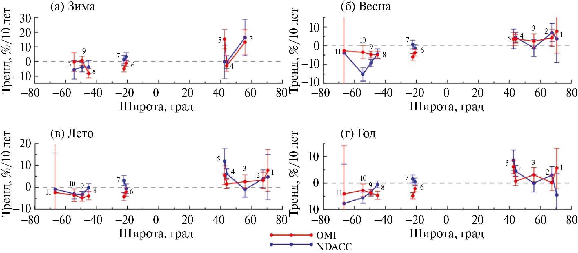 Широтные распределения зимних, весенних, летних и годовых оценок трендов стратосферного содержания NO₂ приведены на рис. 12. На островных станциях Кергелен и Маккуори (№ 9 и 10) в ЮП получены отрицательные (–3% ÷ –5% за 10 лет), а на ст. Иссык-Куль (№ 5) в СП – положительные (около 7% за 10 лет) статистически значимые годовые оценки трендов, близкие по значению для тех и других данных (рис. 12г).