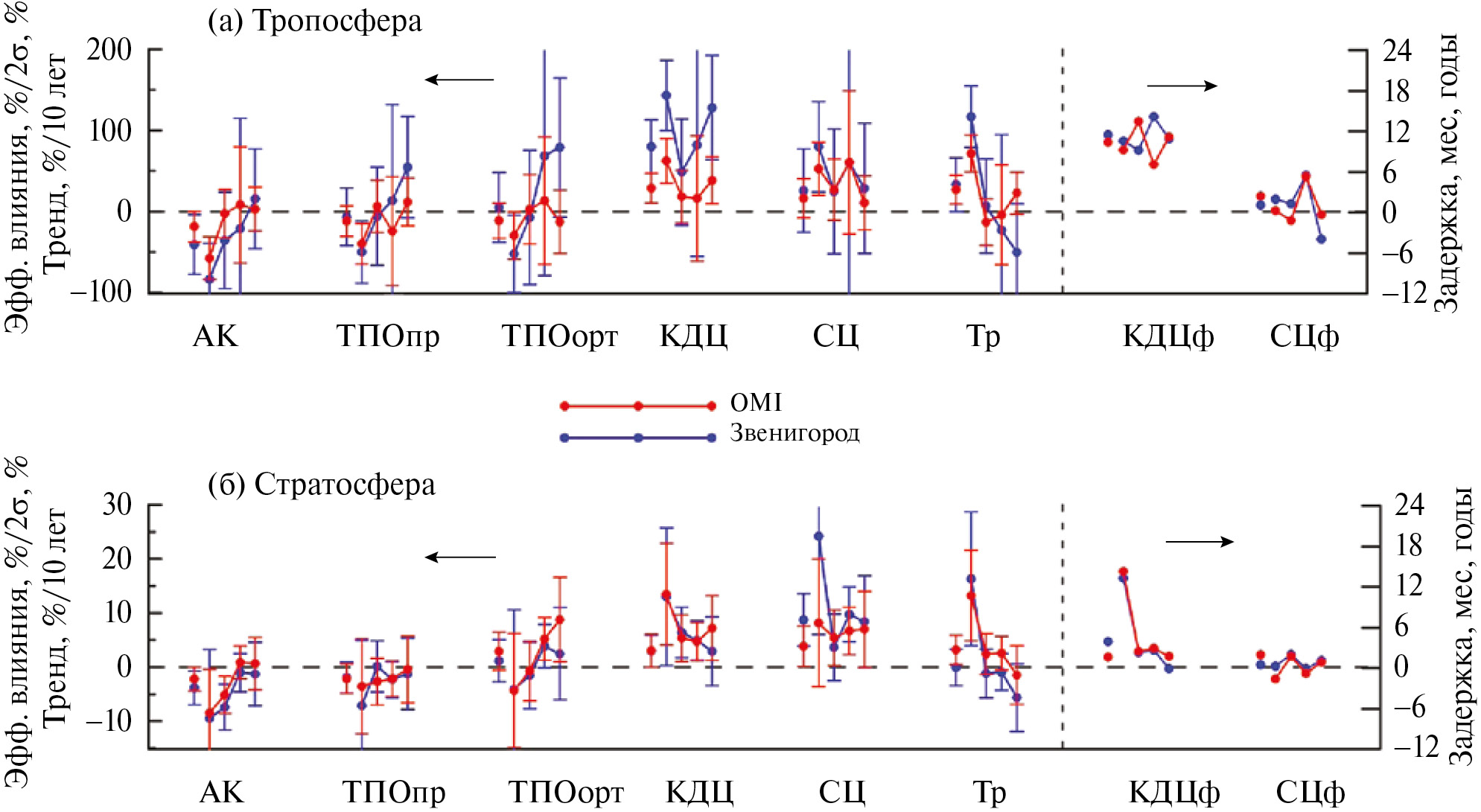 Рис. 13. (а): левая часть графика: годовые (отдельные точки) и сезонные (кривые с точками) оценки изменений тропосферного содержания NO₂ по данным OMI (красный цвет) и результатам измерений на ст. Звенигород под влиянием АК (обозначение АК на горизонтальной оси), вариаций ТПО в области Ниньо 3.4 без задержки (ТПОпр) и с задержкой на 16 месяцев (ТПОорт), КДЦ в экваториальной стратосфере (КДЦ) и 11-летнего солнечного цикла (СЦ), а также оценки линейных трендов NO₂ (Тр). Правая часть графика: фазовые задержки откликов NO₂ на КДЦ скорости экваториального ветра на уровне 40 гПа (обозначение КДЦф на горизонтальной оси) и на 11-летний солнечный цикл (СЦф). (б): аналогично (а), но для стратосферного содержания NO₂. Вертикальные отрезки – 95% доверительные интервалы. Концы доверительных интервалов, выходящие за пределы графика, обрезаны.