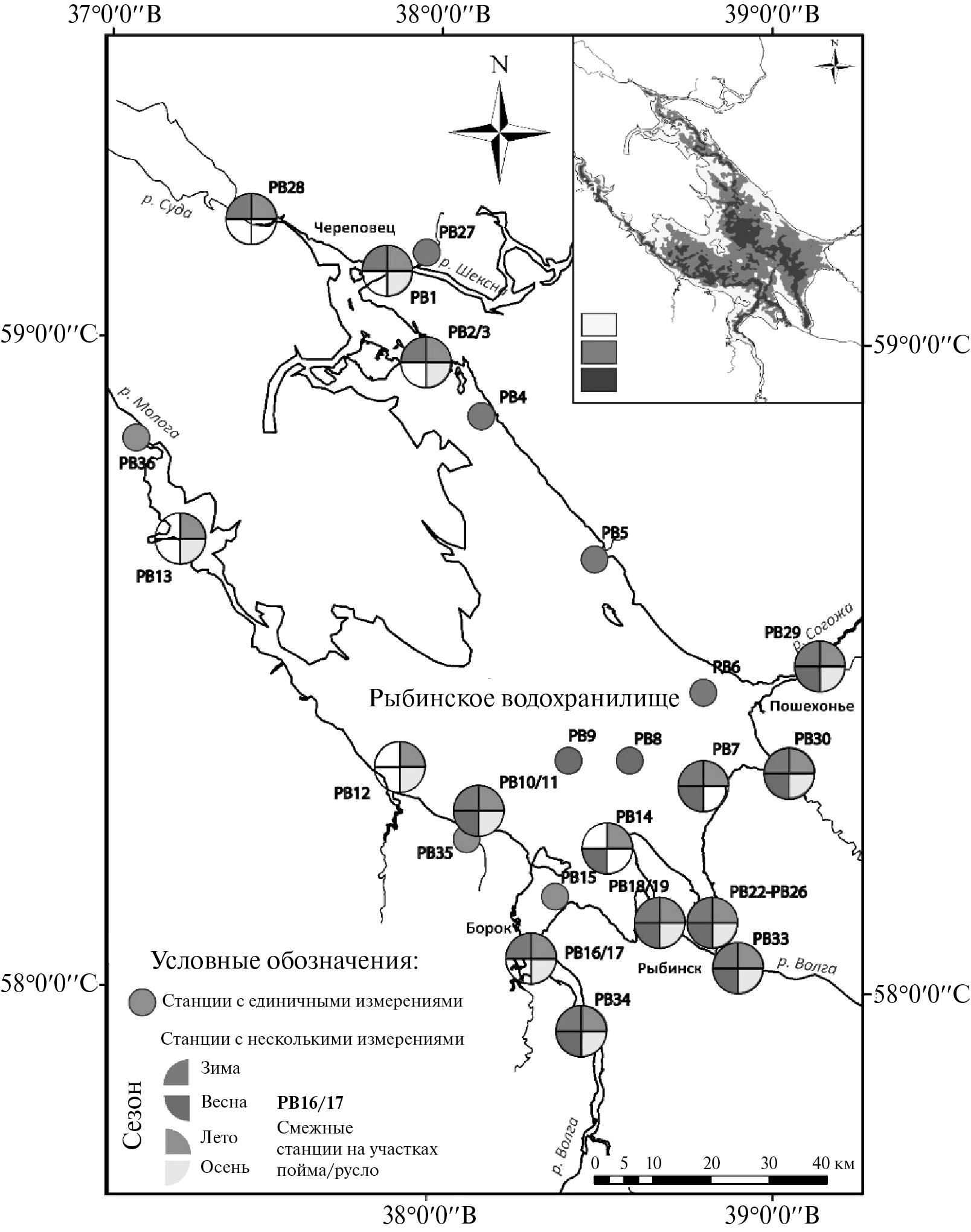 Рассмотрим изменчивость содержания метана в Рыбинском водохранилище в различные сезоны. На рис. 7 представлен график распределения средней по вертикали концентрации метана в воде на станциях измерений. В целом для Рыбинского водохранилища характерны относительно невысокие концентрации метана – на большинстве станций среднее содержание растворенного в воде СН4 не превышает 20 мкл/л. Наименьшие концентрации наблюдались в зимний период. Это связано с невысокой интенсивностью потока метана из донных отложений из-за низких температур и насыщенности придонной воды кислородом. Удельный поток (УП) метана из донных отложений был измерен на трех станциях: РВ7, РВ11, РВ18 и наибольшее значение было измерено над затопленным руслом реки Ухра (РВ7), которое составило 7.55 мгСН4/м²в сут. На двух других станциях УП не превышал 1 мгСН4/м² в сут.