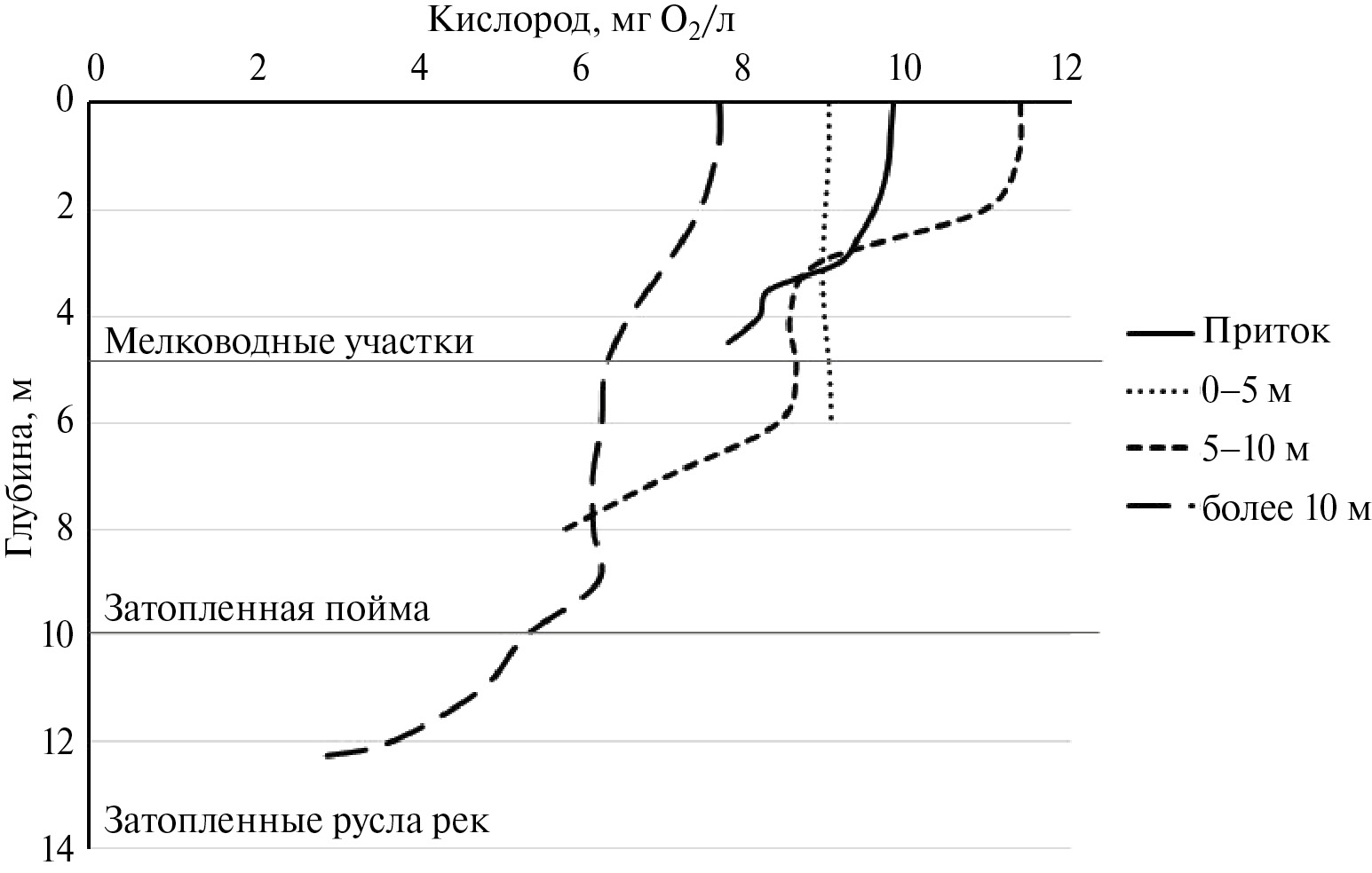 В зимний и весенний период содержание кислорода на станции составляет 70–90%-нас. по всей толще воды, что связано как с поздними сроками замерзания водохранилища, так и с наличием сбросов через гидротехнические сооружения и слабым потреблением кислорода гидробионтами. При этом, перед вскрытием содержание кислорода уменьшается на 10% относительно зимы. У дна (17–15м) фиксируется дефицит кислорода – 10–30%-нас. (1–2 мгO₂/л), что может приводить к увеличению потока метана из донных отложений. В летний период концентрации кислорода уменьшаются и уменьшается растворимость из-за возрастания температуры. На станции формируется прямая температурная стратификация, слой температурного скачка размыт и находится на глубине 3–8 м. Здесь же происходит уменьшение концентрации кислорода с 97 до 70%-нас. В придонных слоях фиксируется аноксия из-за отсутствия перемешивания и интенсивного разложения органического вещества. При этом, на поверхности концентрации кислорода достигают 110%-нас. (10 мгO₂/л) из-за развития фитопланктона. Во время осеннего перемешивания при зондировании концентрация кислорода составляет 93%-нас. (9,8 мгO₂/л) во всех горизонтах.