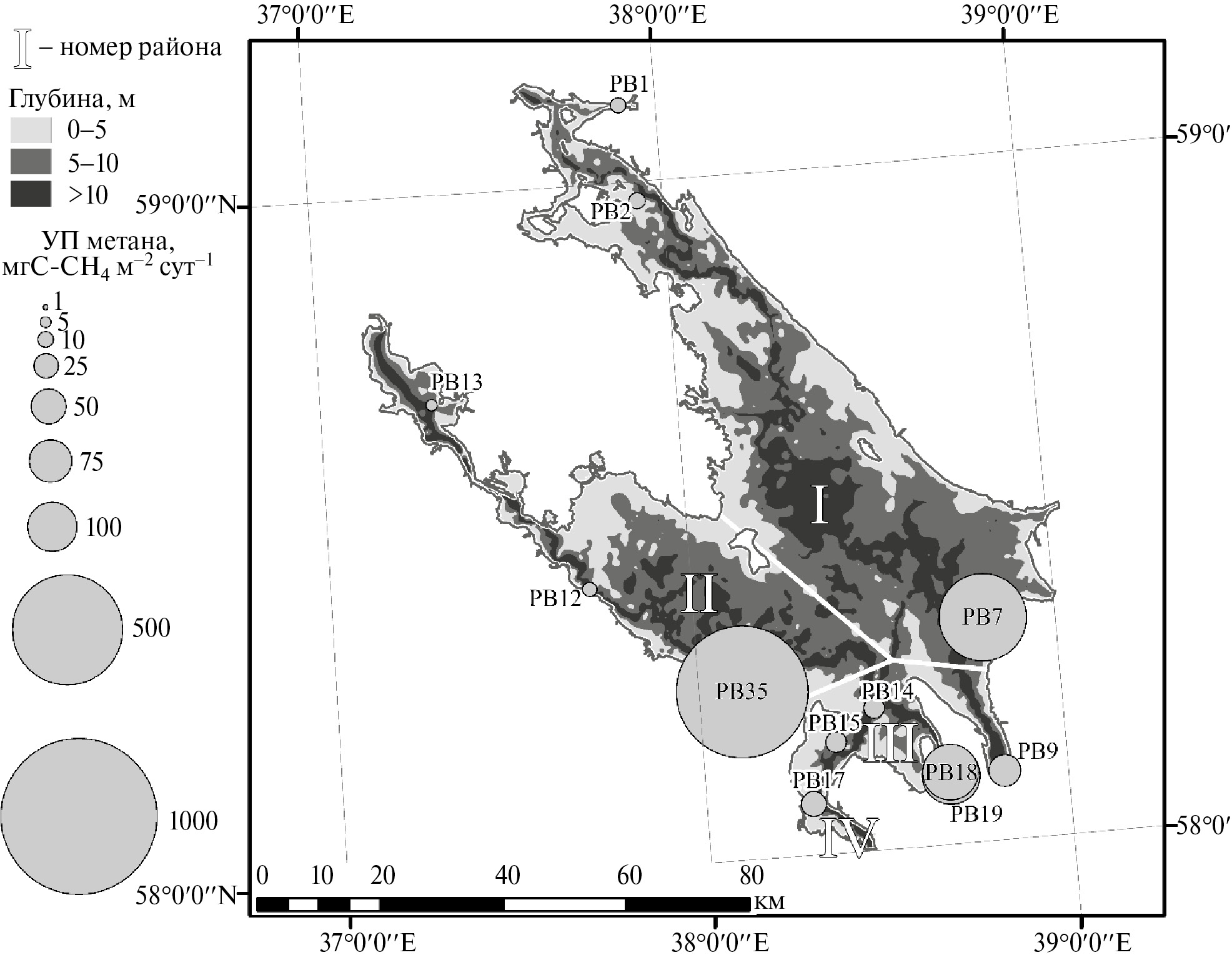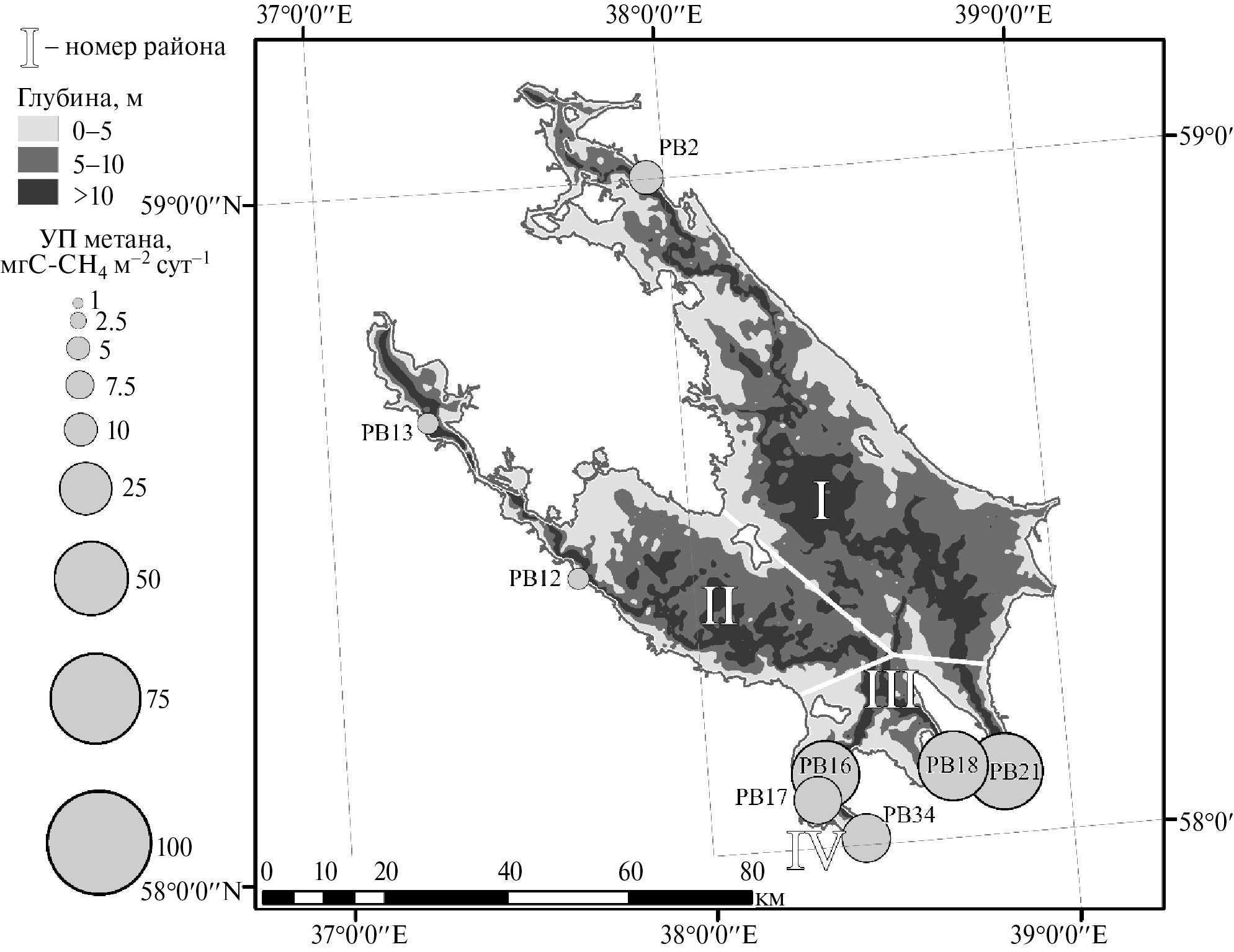 Опираясь на полученные значения удельных потоков метана в периоды открытой воды – осенью и летом была проведена оценка площадной суточной эмиссии метана с поверхности Рыбинского водохранилища. Значения удельных потоков метана осенью можно сгруппировать по их величинам в зависимости от морфологических участков водоема. Опираясь на информацию о батиметрии Рыбинского водохранилища, а также на его гидрологическую структуру были выделены 4 площадных района – Шекснинская акватория, Мологская акватория, приплотинный плес и участок подпора Волги (рис. 11).