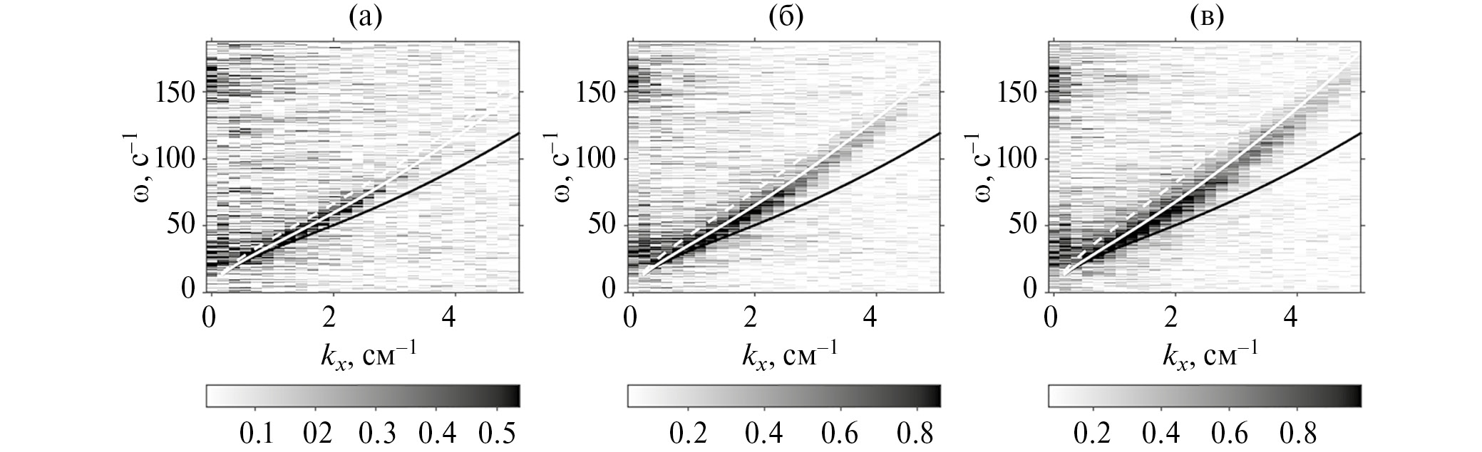 Рис. 5. Дисперсионные кривые для воды на расстоянии 40 см от начала канала. (а) vair = 1.49 м/с, U0 = 9.24 см/с; (б) vair = 2.24 м/с, U0 = 9.60 см/с; (в) vair = 3.32 м/с, U0 = 6.63 см/с. Черная кривая – расчет по формуле (10), пунктирная – расчет по формуле (11), светлая кривая – расчет с учетом профиля скорости. Цветовые шкалы показывают десятичные логарифмы амплитуды спектральной плотности