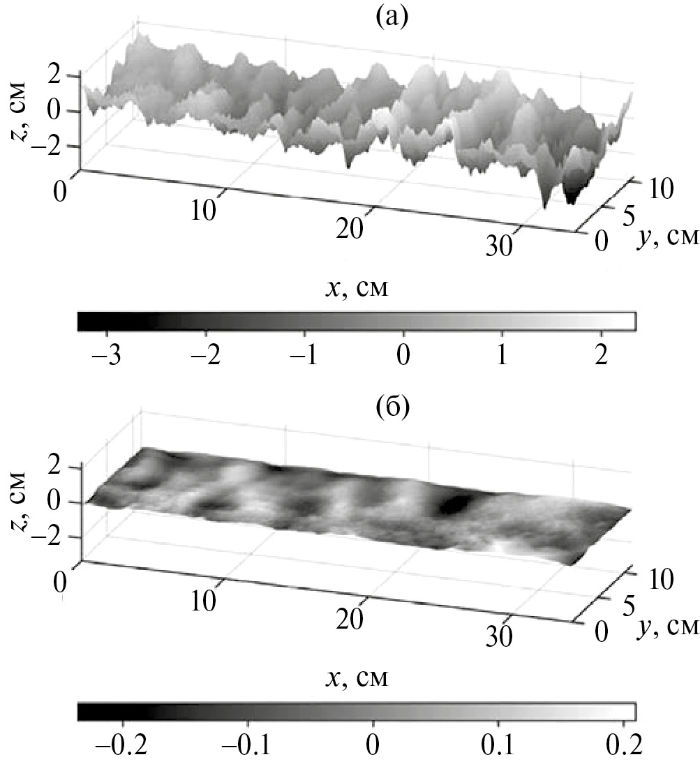 Рис. 2. Примеры измеренных распределений рельефа поверхности в области 2 на рис. 1, при скорости ветра над этой областью 2.7 ± 0.1 м/с: a – в воде, б – в воде с 0.1 мМ SDS (Для наглядности рельеф поверхности окрашен в оттенки серого согласно цветовой шкале соответствующей значениям z)