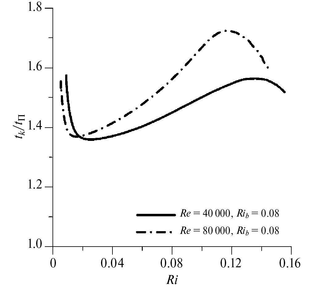 С использованием данных прямого численного моделирования (DNS, Direct Numerical Simulation) турбулентного течения Куэтта при устойчивой стратификации [Mortikov et al., 2019; Zasko et al., 2022] были рассчитаны члены балансовых уравнений (3) и (4). В DNS расчетах использовалась численная модель, развиваемая в НИВЦ МГУ [Mortikov, 2016; Mortikov et al., 2019], а эксперименты проводились при числах Рейнольдса Re до 80000 при последовательном увеличении интегрального числа Ричардсона Rib (определяемого по разнице температуры и скорости на верхней и нижней стенках канала) до ламинаризации потока. На рис. 1 показана зависимость соотношения временных масштабов tk и tП от градиентного числа Ri в двух экспериментах при Re = 4 × 104 и Re = 8 × 104 и фиксированном Rib. Выполнение предположений [Островский, Троицкая, 1987; Соустова и др., 2020; Gladskikh et al., 2023] предполагает, что соотношение tk / tП = 1, что противоречит данным DNS расчетов, где величина