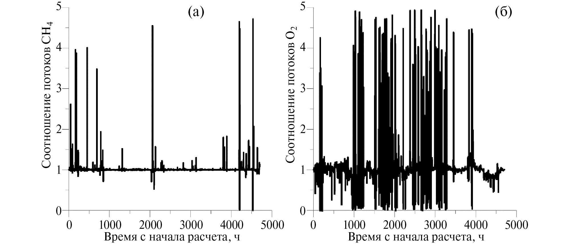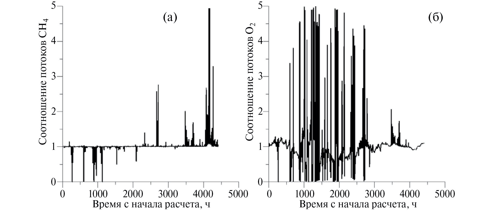 Рис. 6. Соотношения потоков метана (слева) и кислорода (справа) для Рыбинского водохранилища, полученных в конфигурациях параметров (а) и (б)