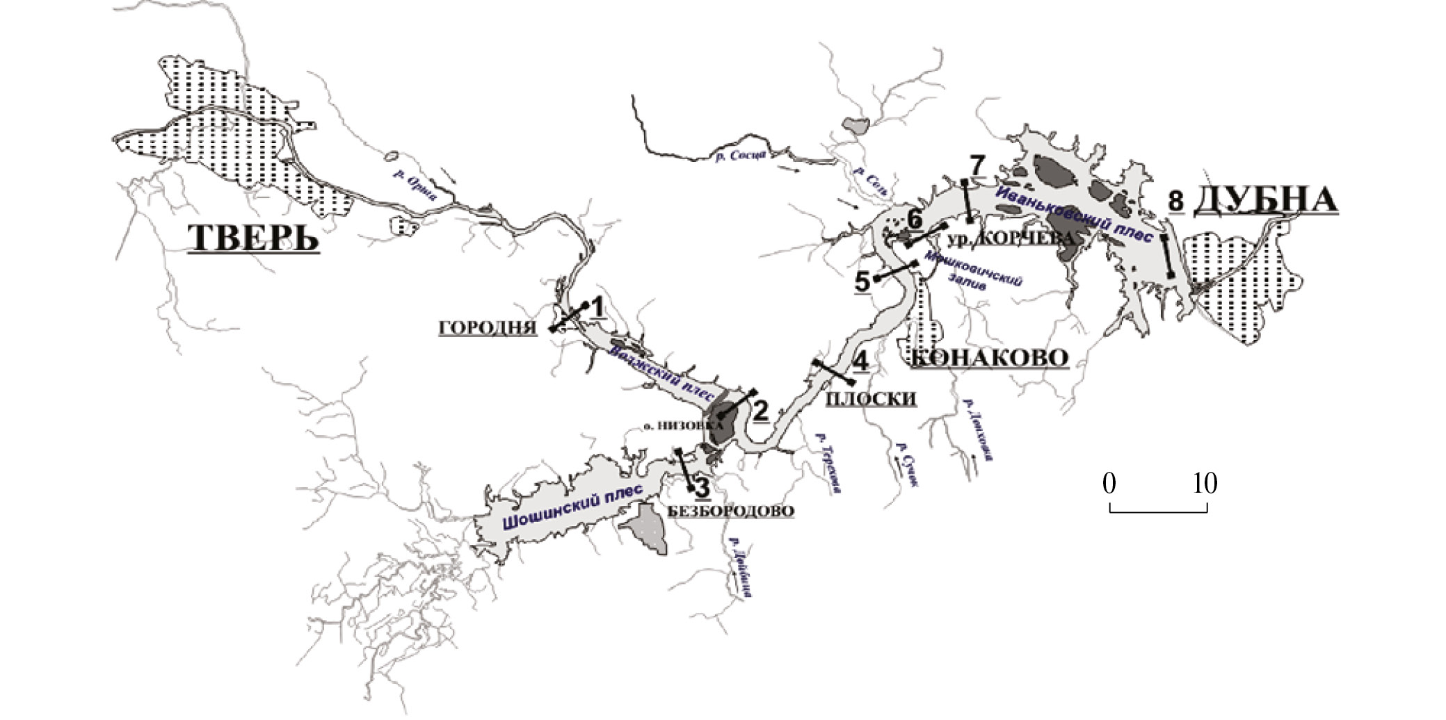 Рис. 1. Схема Иваньковского водохранилища со станциями отбора проб воды, донных отложений и измерений эмиссии метана. 1 – д. Городня, 2 – о-в Низовка, 3 – устье Шошинского плеса, 4 – д. Плоски, 5 – г. Конаково, 6 – устье Мошковического залива, 7 – урочище Корчева, 8 – верхний бъеф Иваньковской ГЭС (Дубна)