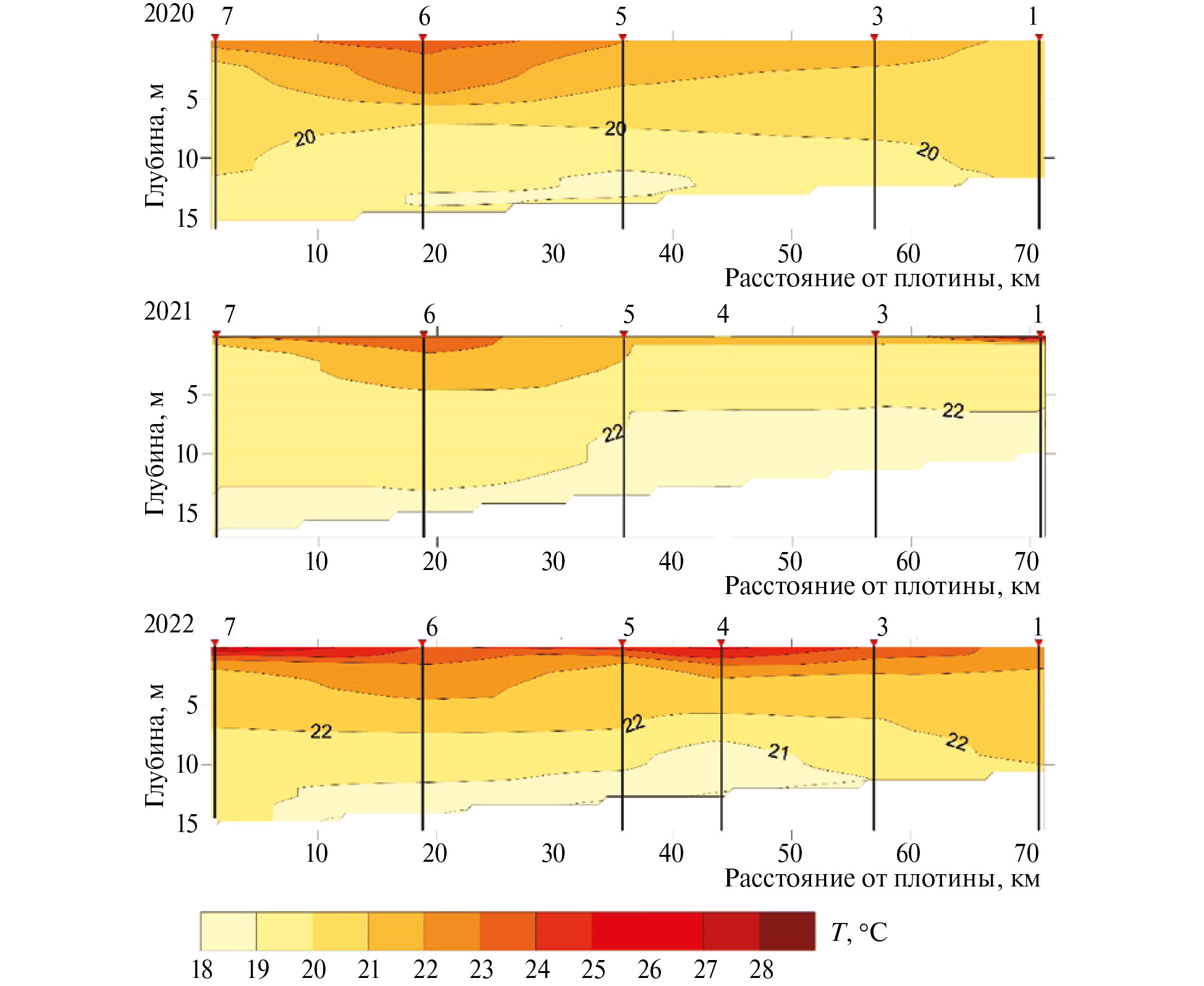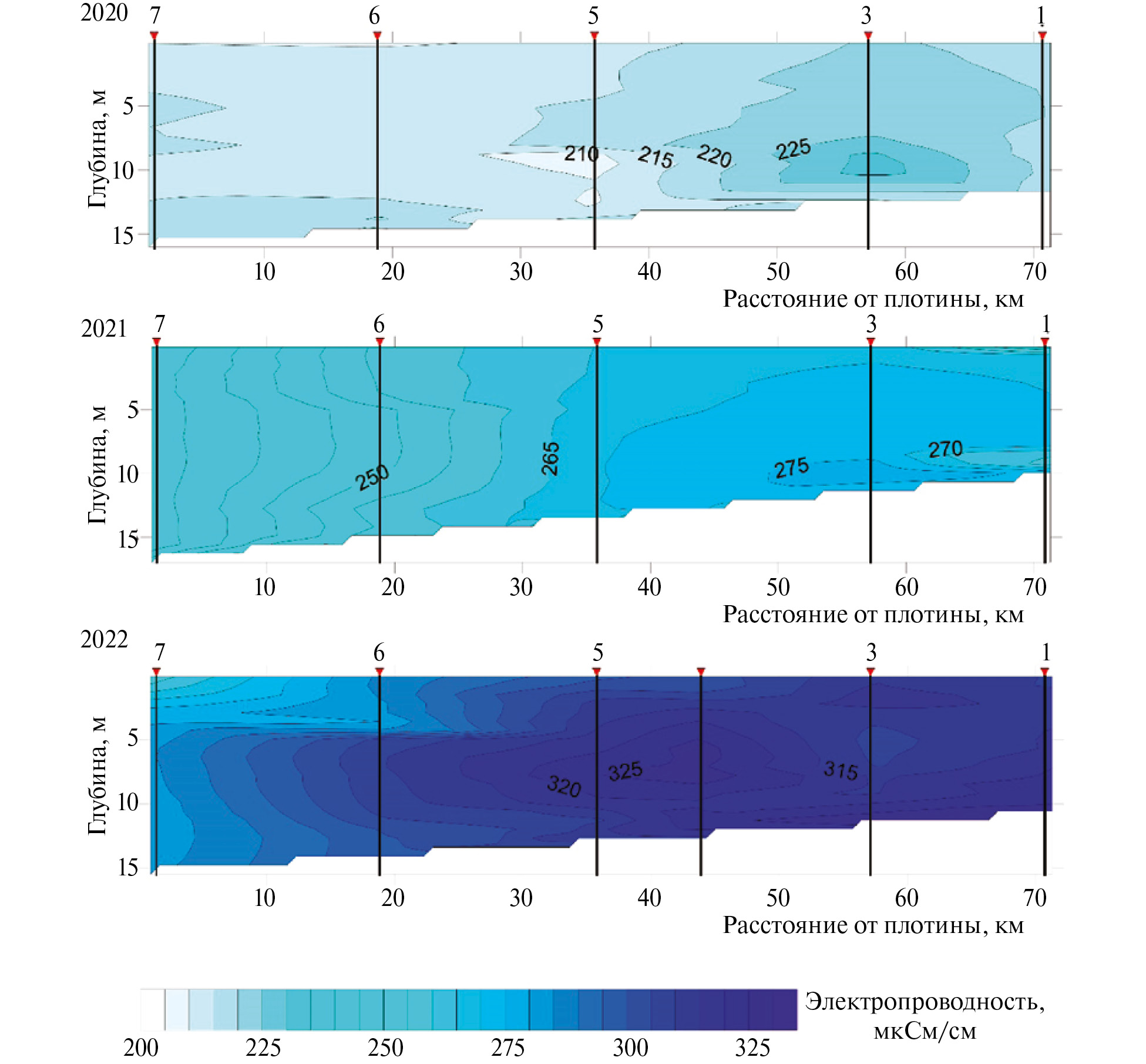 Самый низкий уровень воды (примерно на 0.5 м ниже НПУ) наблюдался в 2022 г. Наибольший приток воды, обусловленный дождевыми паводками, отмечен в июле 2020 г. Максимальная дневная температура воздуха в период проведения съемки была наиболее высокой в 2022 г. Различия гидрометеорологических условий в период, предшествовавший съемкам, обусловили особенности внутриводоемных процессов в исследуемые годы. Съемка в 2020 г. проводилась при относительно теплой антициклональной погоде, однако в предшествующий период времени была прохладная, ветреная погода и в водохранилище еще не сформировался устойчивый термоклин. При этом обильные осадки в июле привели к тому, что электропроводность воды в августе 2020 г. была наименьшей за все три исследуемых года, а насыщение придонных слоев воды кислородом, наоборот, наибольшим (до 4.8 мг/дм3 в створе Дубна, при 0.5 мг/дм3 в 2021 и 2022 гг.). Устойчивый антициклон в июле 2022 г. привел к прогреву водной массы водохранилища (температура придонного слоя воды у плотины достигала 21.2 °С) и формированию устойчивого слоя температурного скачка по всему водоему. В 2020 и 2021 гг. содержание растворенного кислорода снижалось до величин менее 2 мг/дм3 только в придонных горизонтах наиболее глубоководных станций, а в жарком 2022 г. зона с дефицитом кислорода достигала горизонтов 9–10 м (рис. 2–4).