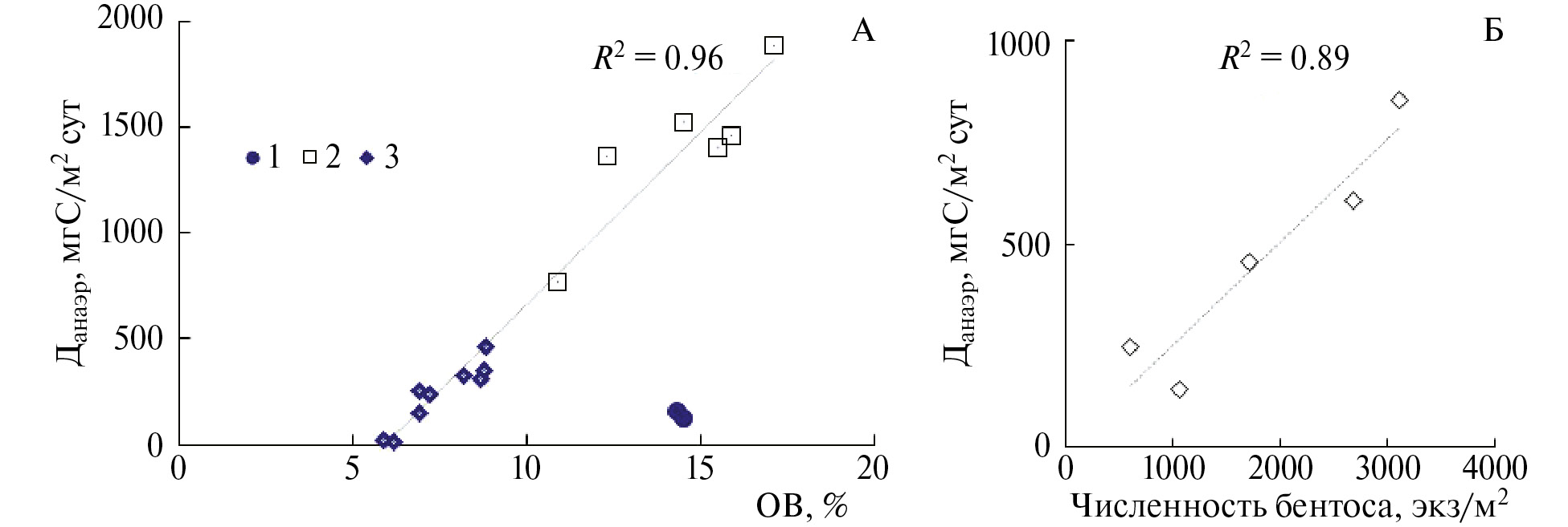 На график А рис. 5 были добавлены ранее полученные данные по интенсивности Данаэр Можайского водохранилища для пойменных станций (получены авторами работы) с похожими на исследованные на Иваньковском водохранилище грунтами при аэробных условиях. Численность роющего бентоса на этих станциях была менее 4000 экз/м2. Эти точки дополняют зависимость Данаэр от ОВ при соответствующей численности бентоса. При аэробных условиях в придонном горизонте для грунтов Иваньковского водохранилища отмечается тенденция увеличения интенсивности анаэробной деструкции при увеличении численности роющего зообентоса (рис. 5, график Б).