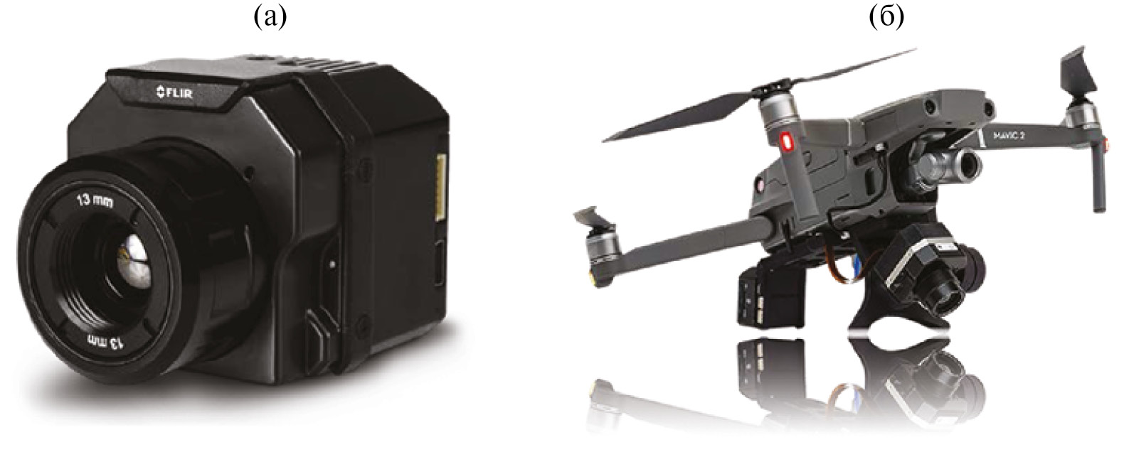 Нами использован измерительный комплекс на базе квадрокоптера DJI Mavic 2 Zoom с установленным тепловизором Flir TAU2R (рис. 2). Для установки тепловизора на квадрокоптер использован подвес производства голландской компании DroneExpert (https://dronexpert.nl/en/), стабилизирующий положение тепловизора относительно земли. Для подачи питания для тепловизора и его подвеса на корпус квадрокоптера выведен дополнительный разъем (монтаж выполнен сотрудниками компании DroneExpert). Используемая модификация тепловизора Flir TAU2R имеет размер матрицы 336 × 256 пикселей, размер пикселя 17 мкм, фокусное расстояние 9 мм, угол обзора 35°. Тепловизор работает в спектральном диапазоне 7.5–13.5 мкм.
