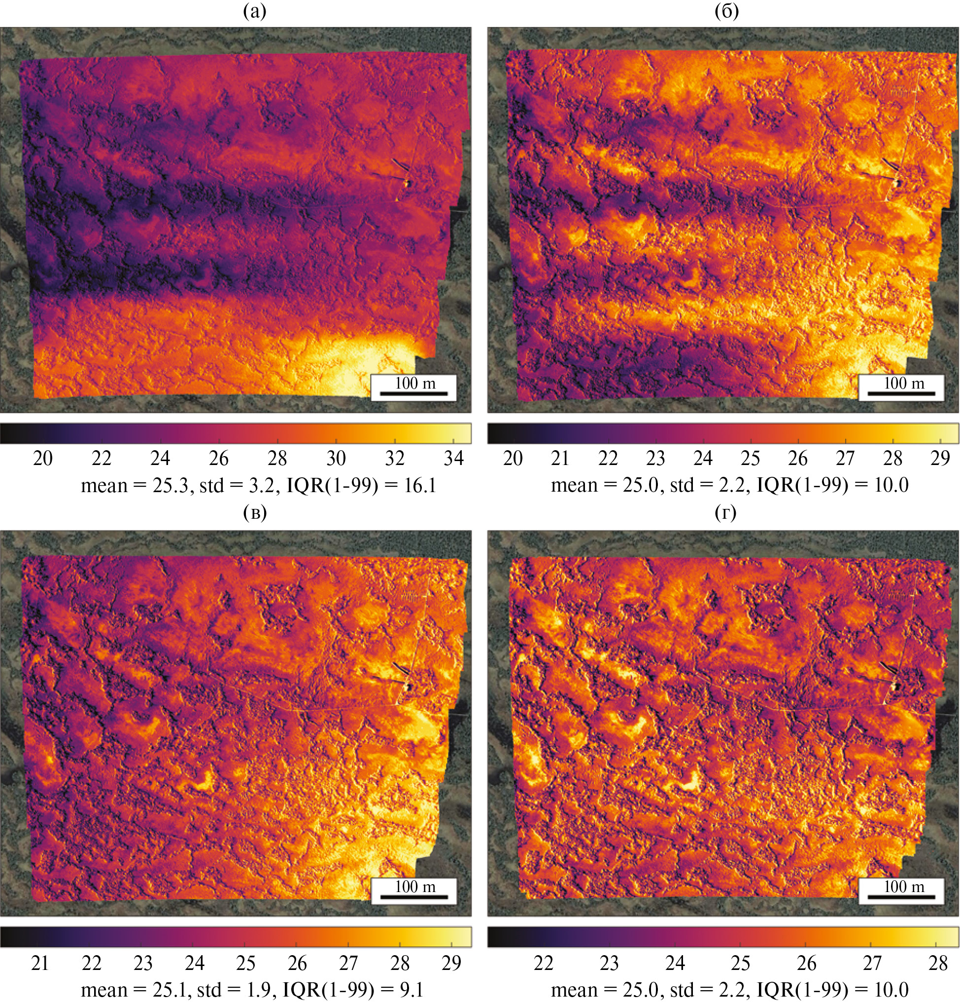 Рис. 6. Тепловые ортомозаики, построенные по исходным данным тепловой схемки (а) и по данным после применения первого (б) и второго (в) и третьего (г) шагов алгоритма коррекции для болотного полигона на территории исследовательской станции Мухрино вечером 17 июня 2022 г. (17:30). Снизу от каждой ортомозаики приведено среднее значение (mean), стандартное отклонение (std) и разность 99-го и 1-го перцентилей (IQR)