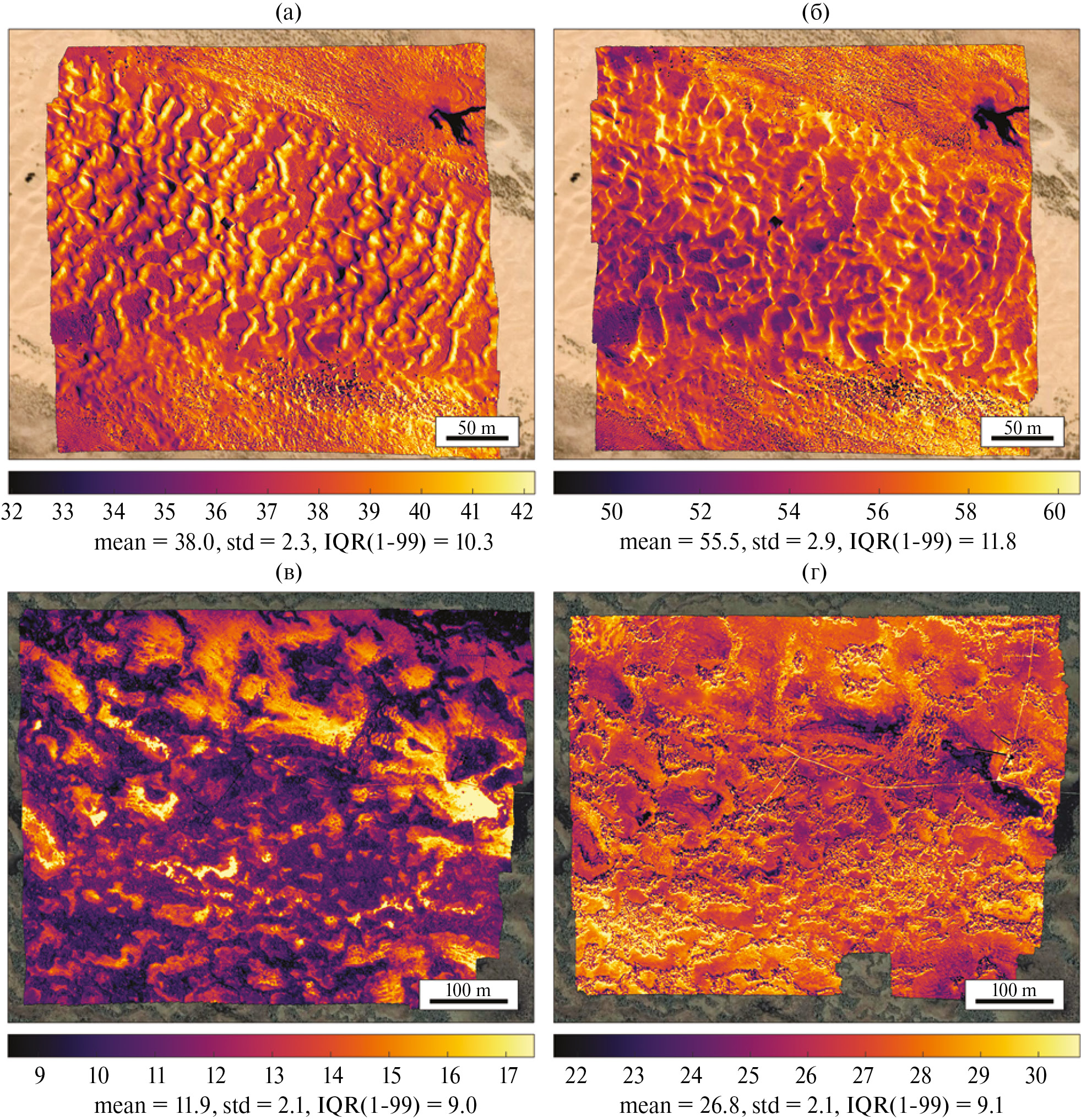 Рис. 7. Тепловые ортомозаики для природных полигонов: для зоны барханов в районе поселка Нарын-Худук (Калмыкия) по данным съемки утром (а) и днем (б) 22 июля 2021 г., для верхового болота на территории исследовательской станции Мухрино по данным съемки ночью (в) и днем (г) 16–17 июня 2022 г. Снизу от каждой ортомозаики приведено среднее значение (mean), стандартное отклонение (std) и разность 99-го и 1-го перцентилей (IQR). (а) Барханы, утро (22.07.2021, 08:25), (б) Барханы, день (22.07.2021, 14:15), (в) Верховое болото, ночь (16.06.2022, 23:30), (в) Верховое болото, день (17.06.2022, 11:25)