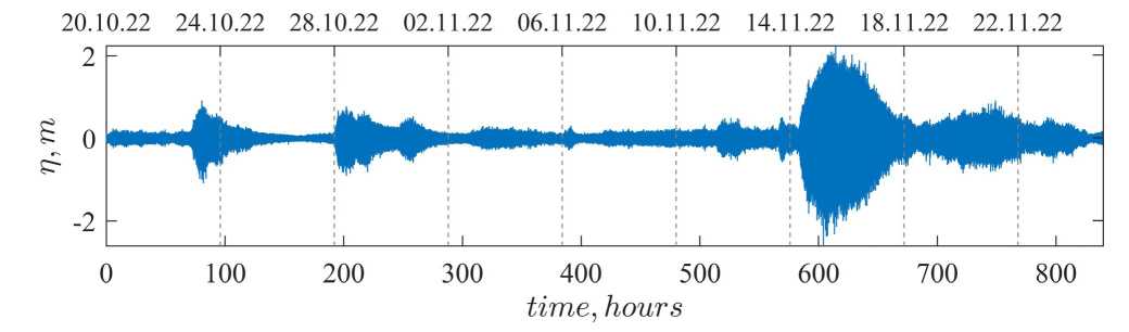 В настоящей работе для пересчета фильтрованных данных давления Phyd,filt(t)/(ρg) в смещение морской поверхности над точкой измерений η(t) используется гидростатическая теория, аналогично предшествующим работам [Зайцев и др., 2011; Кузнецов и др., 2014; Кокорина и др., 2022; Слюняев и др., 2023a]: η(t) = Phyd,filt(t)/(ρg). Для ее применимости требуется выполнение условий мелкой воды и линейности волн, что для обсуждаемых измерений происходит далеко не всегда. Эффектами отклонения от гидростатической теории в настоящей работе пренебрегается. По этой причине с большей долей строгости можно считать, что проводимое ниже исследование касается записей донного давления.